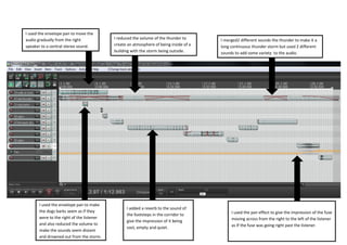 The document describes how various audio effects were used to manipulate sounds and create different impressions for the listener. Effects like panning, reducing volume, and reverb were used to make barks seem like they were coming from the right, make thunder sound distant from inside a building, and make footsteps echo as if in a vast empty space. Different sounds were also merged to create a continuous thunderstorm with variety. Panning was used to make a fuse sound like it moved from right to left past the listener.