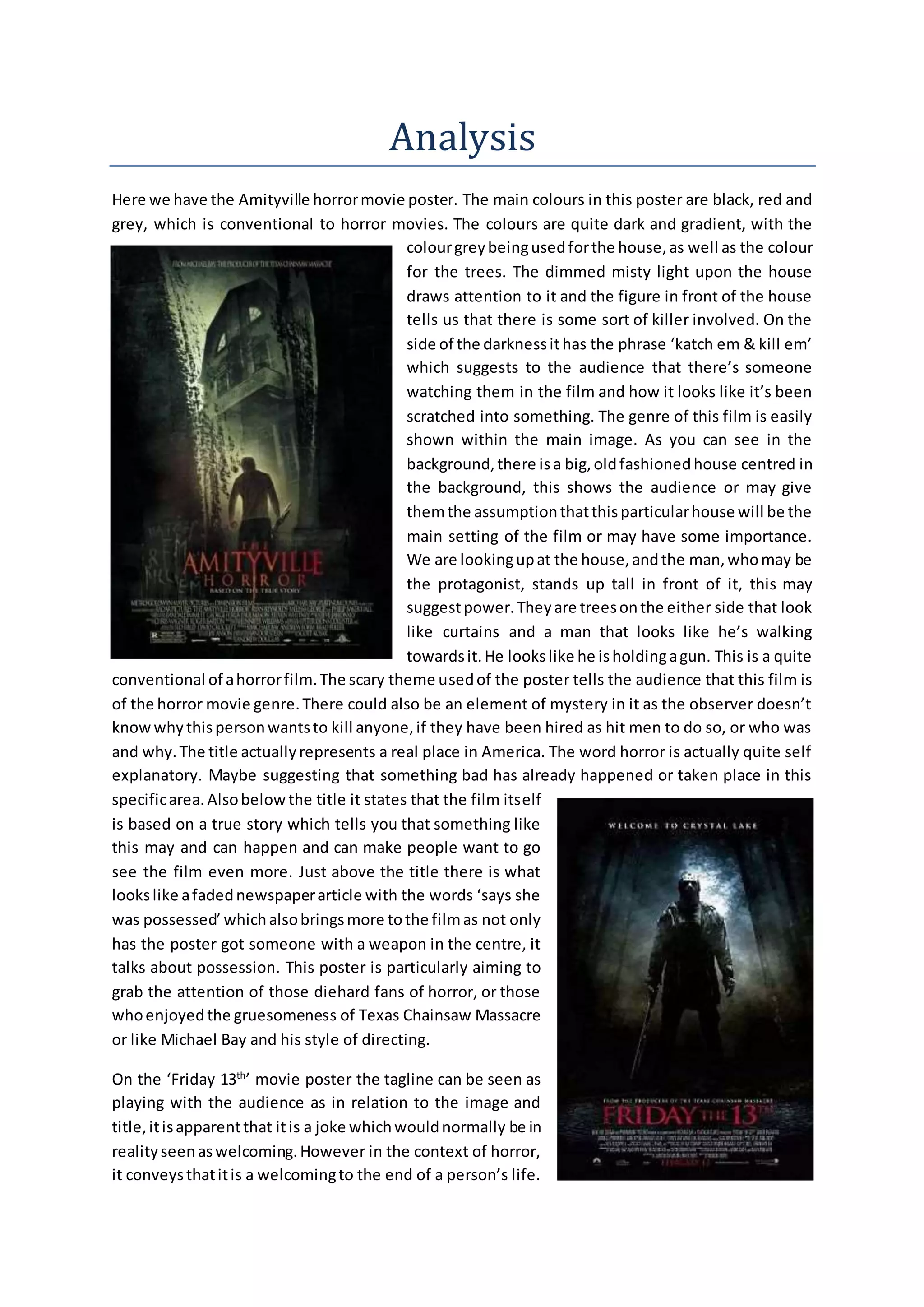 The document analyzes several movie posters and magazine covers, describing their visual elements and how they convey information to viewers. It discusses the Amityville Horror poster's use of dark colors and a figure holding a gun to suggest a killer is involved. It also examines posters for Friday the 13th and Nightmare on Elm Street, noting visual cues like weapons, villains, and taglines that establish the films' genres and draw interest. Magazine covers for I Am Legends and Shutter Island are summarized, focusing on how imagery, text, and stars are used to inform viewers of the films' genres, plots, and main characters.