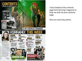 The document analyzes and compares the contents pages of two music magazines - Kerrang! and Mojo. For Kerrang!, the summary notes that the page is divided in half with a large image at the top highlighting the cover story. Smaller images and four columns of text list other articles. Headings are in a bold yellow font for consistency. The language uses informal tones and punctuation to appeal to teenagers. For Mojo, the summary states that the two-page contents is more spaced out than Kerrang!'s. Photos include posed shots, concert images, and author pictures. The language is more formal and straightforward to suit Mojo's older audience.