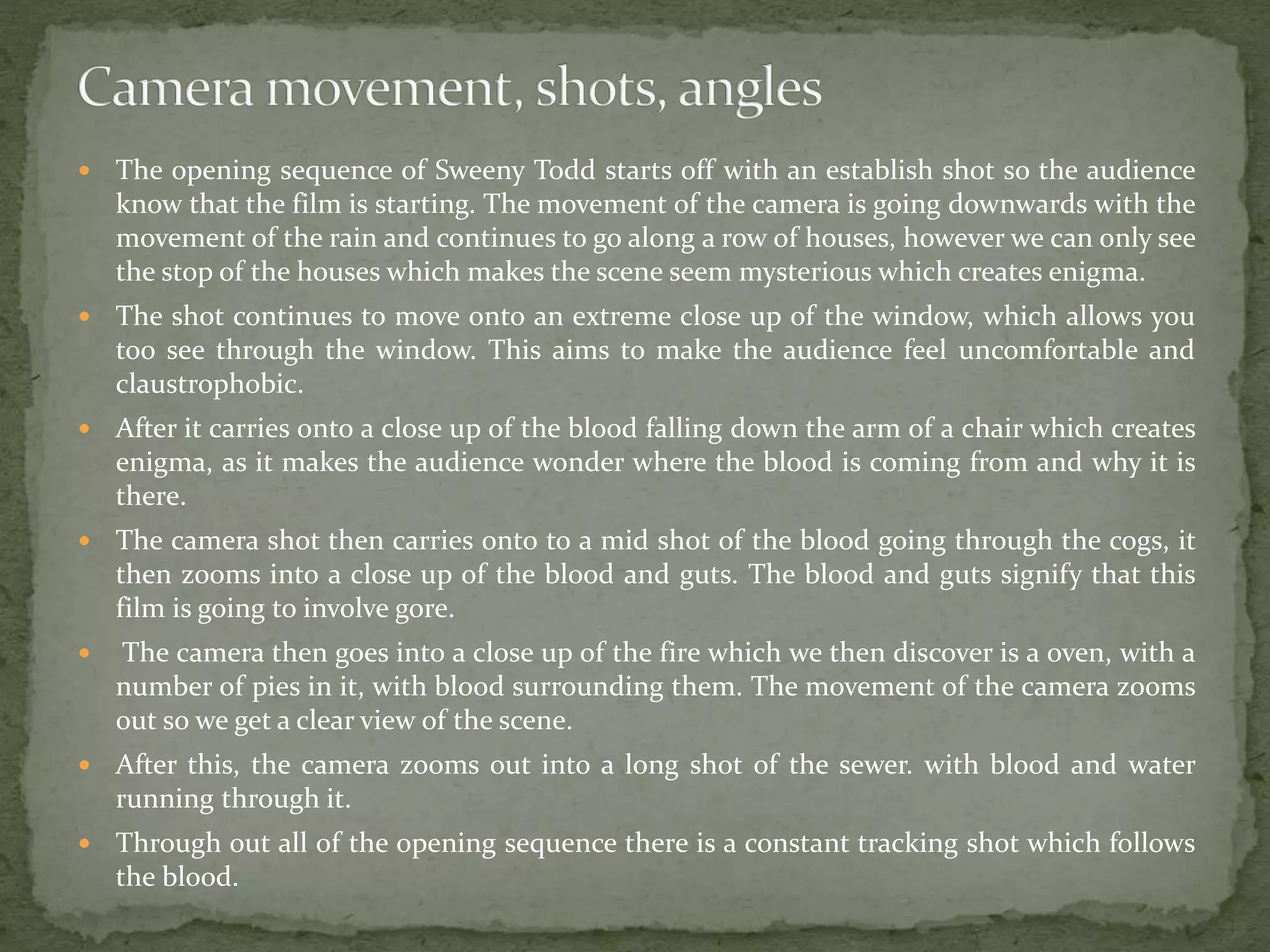 The opening sequence of Sweeney Todd establishes the dark, gloomy setting through its use of color, lighting, and props. Dark colors like black and red are prominently featured. The old, run-down building shown appears dark and ominous. Unsettling images like blood and implied violence further a sense of danger and mystery. The tense, ominous music builds a feeling of impending threat. All of these elements combine to strongly suggest to the audience that this will be a horror film.