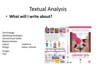 This document analyzes the textual elements and visual codes used in DVD cover design. It discusses terminology related to different parts of the DVD cover like the central image, back cover, and spine. Color schemes, fonts, images, and other design elements are used to represent the genre, target particular audiences, and position viewers. Close analysis of these components can provide insight into how meaning is constructed and audiences are targeted for different films.