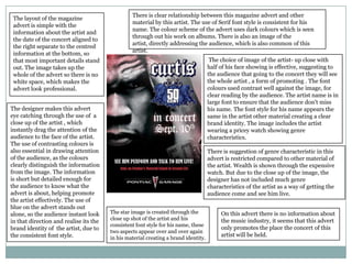 The magazine advert uses an abstract close-up image of the artist centered on the page to draw attention. In large bold font below the image is the artist's name, consistent with his branding. Minimal additional information is included about the album release date to intrigue audiences to learn more without revealing too many genre characteristics. The simple layout and strong contrast between image and font make key details stand out clearly.