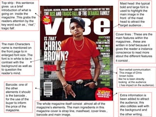 The document analyzes magazine front covers and contents pages. It discusses various design elements like mastheads, cover lines, images, fonts, colors and how they are used to attract audiences. Key elements include the masthead to identify the magazine, cover lines highlighting main stories, images of celebrities or events, and varying font sizes and colors to draw attention and convey information. The purpose is to entice readers with the topics and visually appeal to the intended readership through stylistic choices.