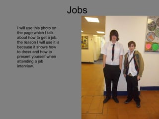 This document discusses using various photos from the author's collection on different pages of a school project. The photos include images showing proper job interview attire, a student receiving their GCSE results, facilities at Biddulph High School, dance results, a Kenya exchange student event, and photos featuring a student being named "pupil of the week" that will be used on the front cover in the corner.