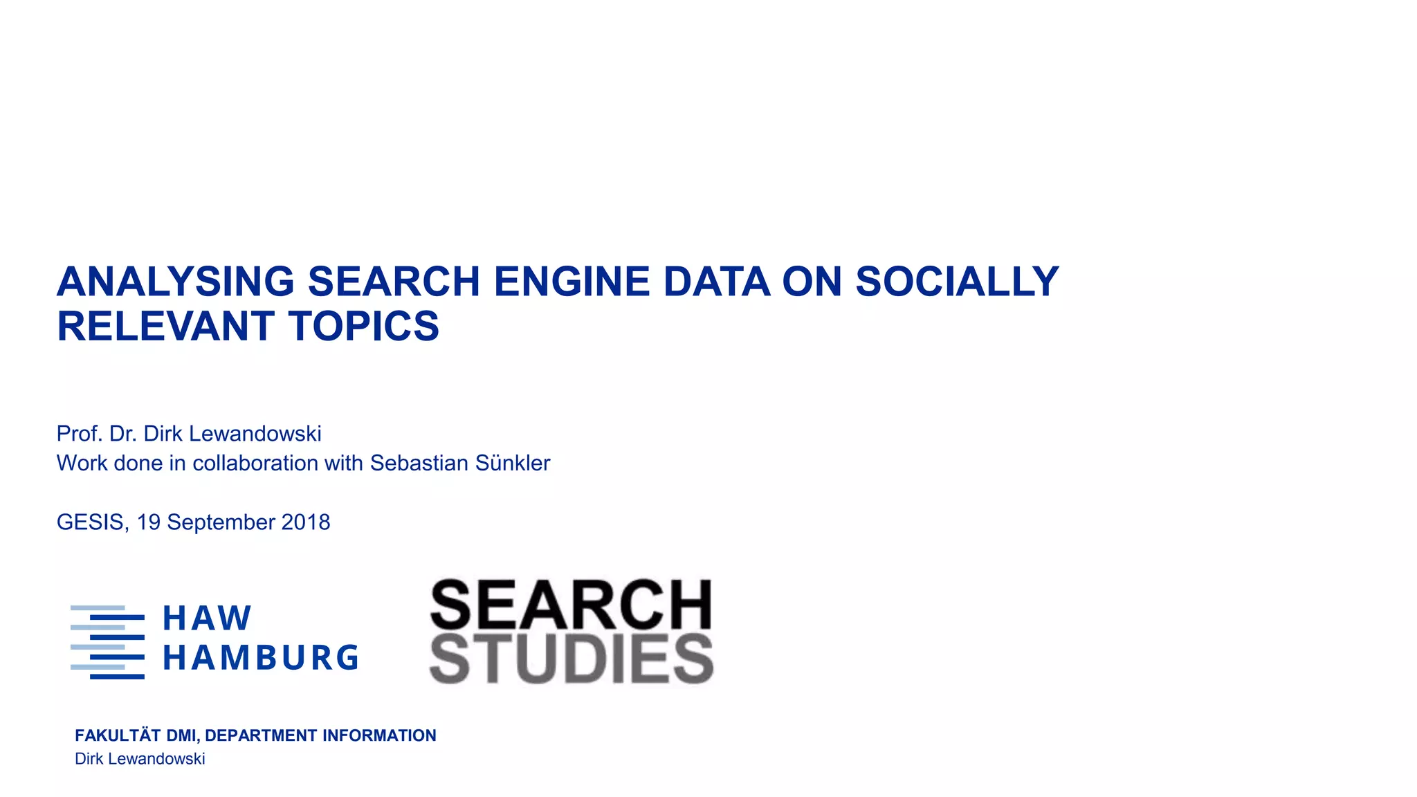 This document summarizes a presentation on analyzing search engine data for socially relevant topics. It discusses collecting search results data at scale by automatically querying search engines and scraping results pages. A case study on insurance comparisons is presented where over 20,000 search results were analyzed for 121 queries. The results showed that a small number of domains and providers dominated the top search positions. Limitations and future work are also outlined.