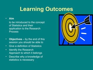 This document provides an overview of quantitative data analysis and statistics. It defines statistics and describes descriptive and inferential statistics. Descriptive statistics organize and summarize data through tables and graphs, while inferential statistics allow inferences about populations from samples. Randomized control trials are described as an important use of inferential statistics. Key statistical concepts like mean, mode, median, probability, and p-values are also defined. Common statistical software and tests are listed. The importance of understanding statistics for researchers to properly design studies, analyze results, and understand the significance of findings is discussed.