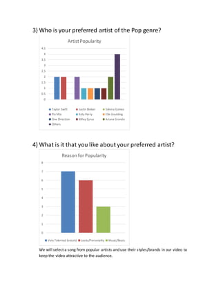 The document discusses research into preferences of a target audience aged 16-30 for a pop/EDM music video. It analyzes factors like preferred artists, expectations for music videos, and how the audience finds new music. The key findings are that relationships and narrative are important to include per pop music conventions, while colors should also be incorporated for broader appeal. The video will be uploaded to YouTube for easy access by the target demographic.