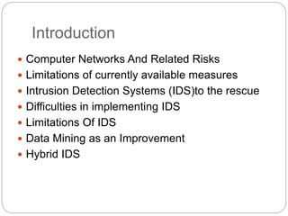 This document discusses using data mining techniques to improve intrusion detection systems (IDS). It begins by introducing computer network risks and limitations of existing IDS approaches. It then discusses using data mining algorithms like ID3, k-means clustering, and Apriori pattern mining within a hybrid IDS framework. The framework includes sensors to collect host and network data, a data warehouse for storage, and an analysis engine using misuse detection, anomaly detection and data mining algorithms to detect intrusions. It concludes that data mining allows IDS to detect both known and unknown attacks more efficiently.