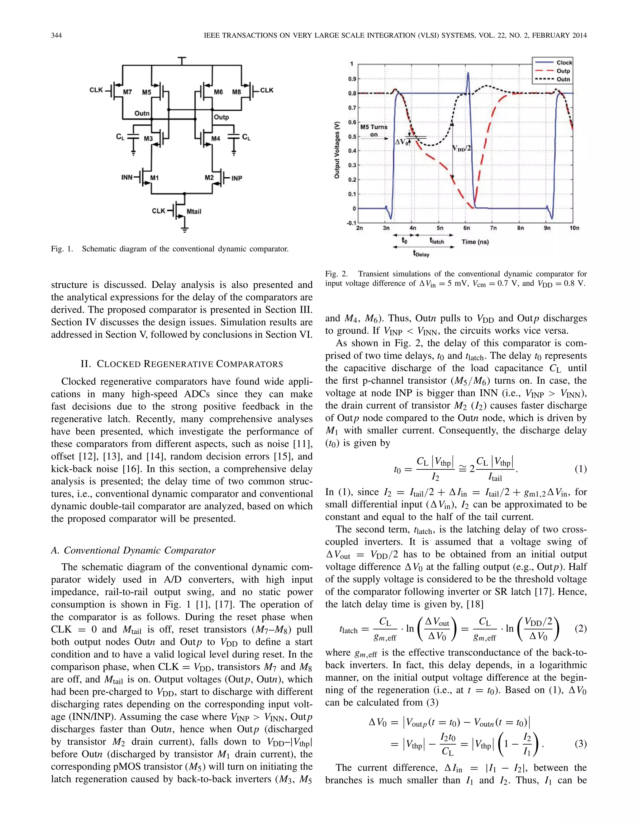 The document presents an analysis of the delay characteristics of dynamic comparators. It analyzes the delay of conventional dynamic and double-tail comparators, deriving analytical expressions showing the impact of various design parameters on delay. A new dynamic comparator is then proposed based on modifying the circuit of a conventional double-tail comparator to strengthen positive feedback, reducing delay time. Simulation results on the proposed comparator show significantly reduced power consumption and delay compared to conventional designs, enabling higher clock frequencies at lower supply voltages.