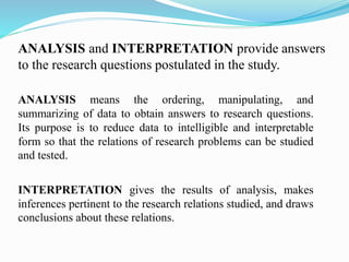 The document discusses various statistical analysis methods and their purposes. It defines descriptive statistics as methods used to describe characteristics of a population or sample, such as measures of central tendency, dispersion, location, and distribution. Inferential statistics draw inferences from samples to make generalizations about populations. The document outlines specific descriptive and inferential statistical tests for both parametric and nonparametric data, and explains that the appropriate statistical method depends on the research problem and level of measurement used in a study.