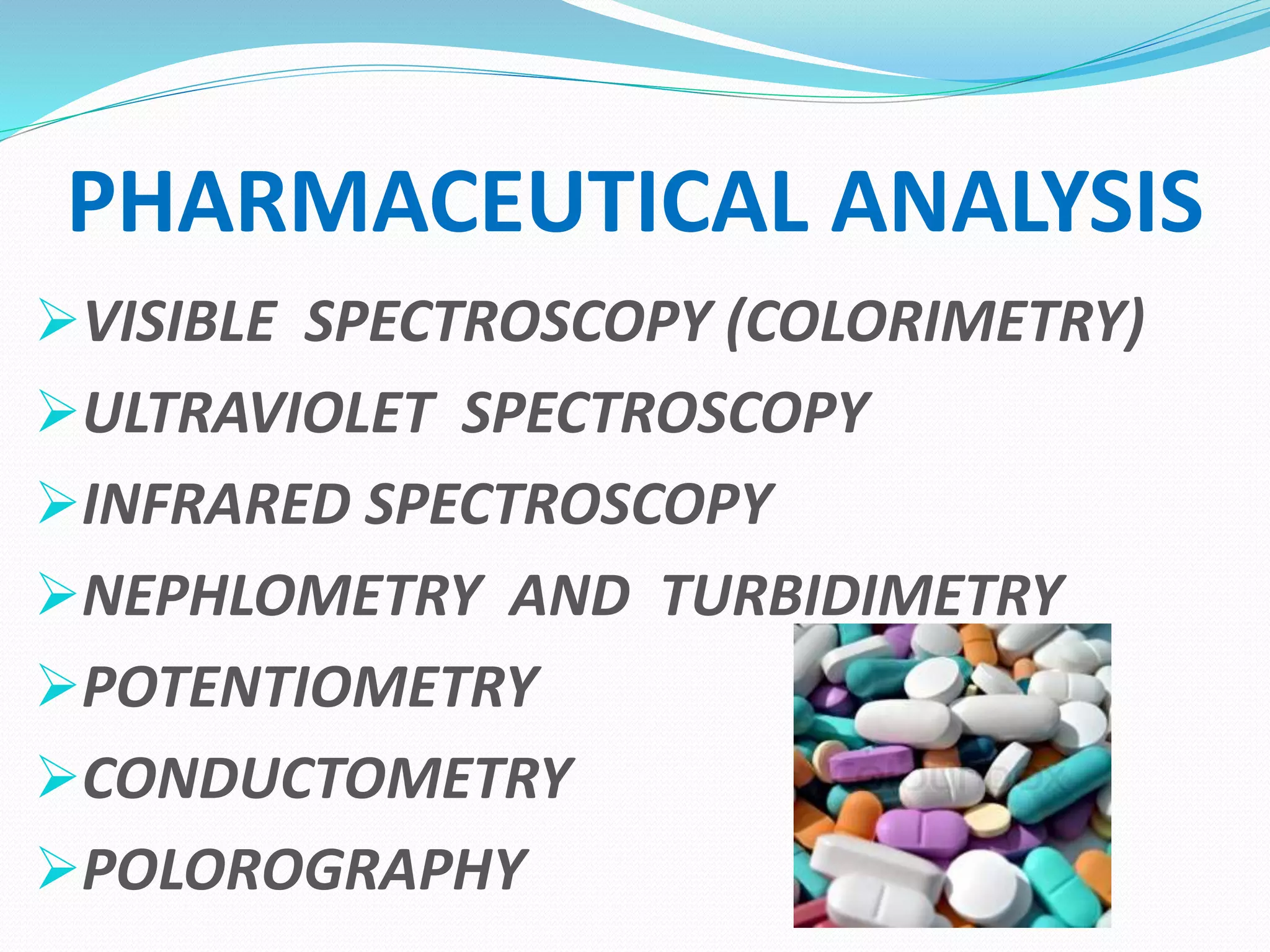 This document discusses visible spectroscopy, which analyzes absorption of visible light. It can determine drug concentrations by measuring absorbance at different wavelengths. Key aspects covered include Beer's and Lambert's absorption laws, common instrumentation like light sources, filters, monochromators, sample cells and detectors. Applications include purity testing, quantitative analysis, and determining functional groups or molecular weights. Key terms defined are chromophore, auxochrome, isobestic point, and bathochromic, hypsochromic, hyperchromic, and hypochromic effects.