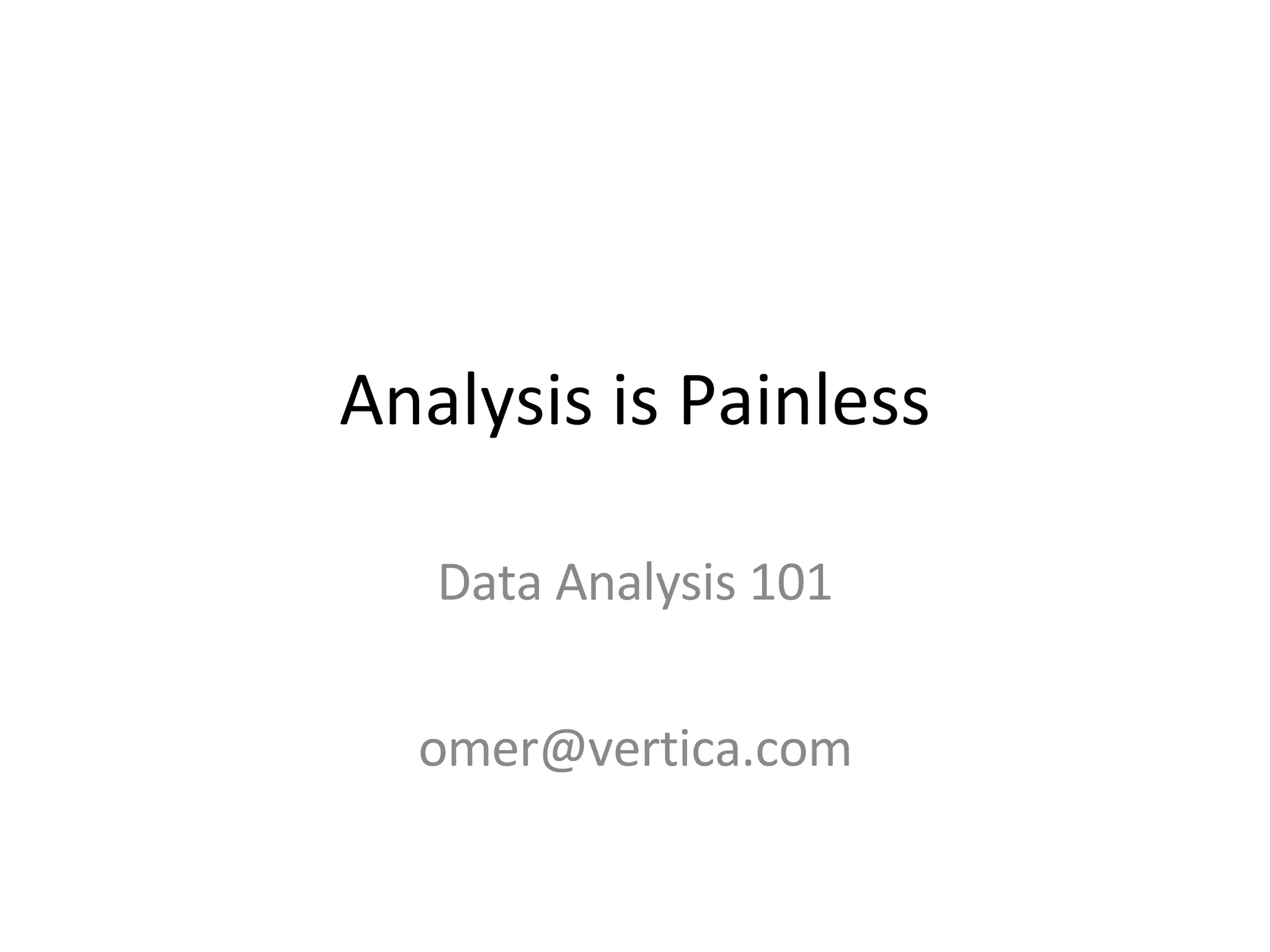 The document provides an overview of getting started with data analysis using Hadoop and Vertica. It recommends starting with a small sample dataset of around 1GB to practice developing patterns before optimizing. For Hadoop, it explains that the Map, Reduce, and Main functions are the core components, with Map parsing data into key-value pairs and Reduce combining matching keys. For Vertica, it notes that basic usage involves defining a schema, loading data via copy or insert, and running queries like counts and aggregations. The goal is to pick a tool, start with a simple demo or sample, and focus on functionality before optimization.