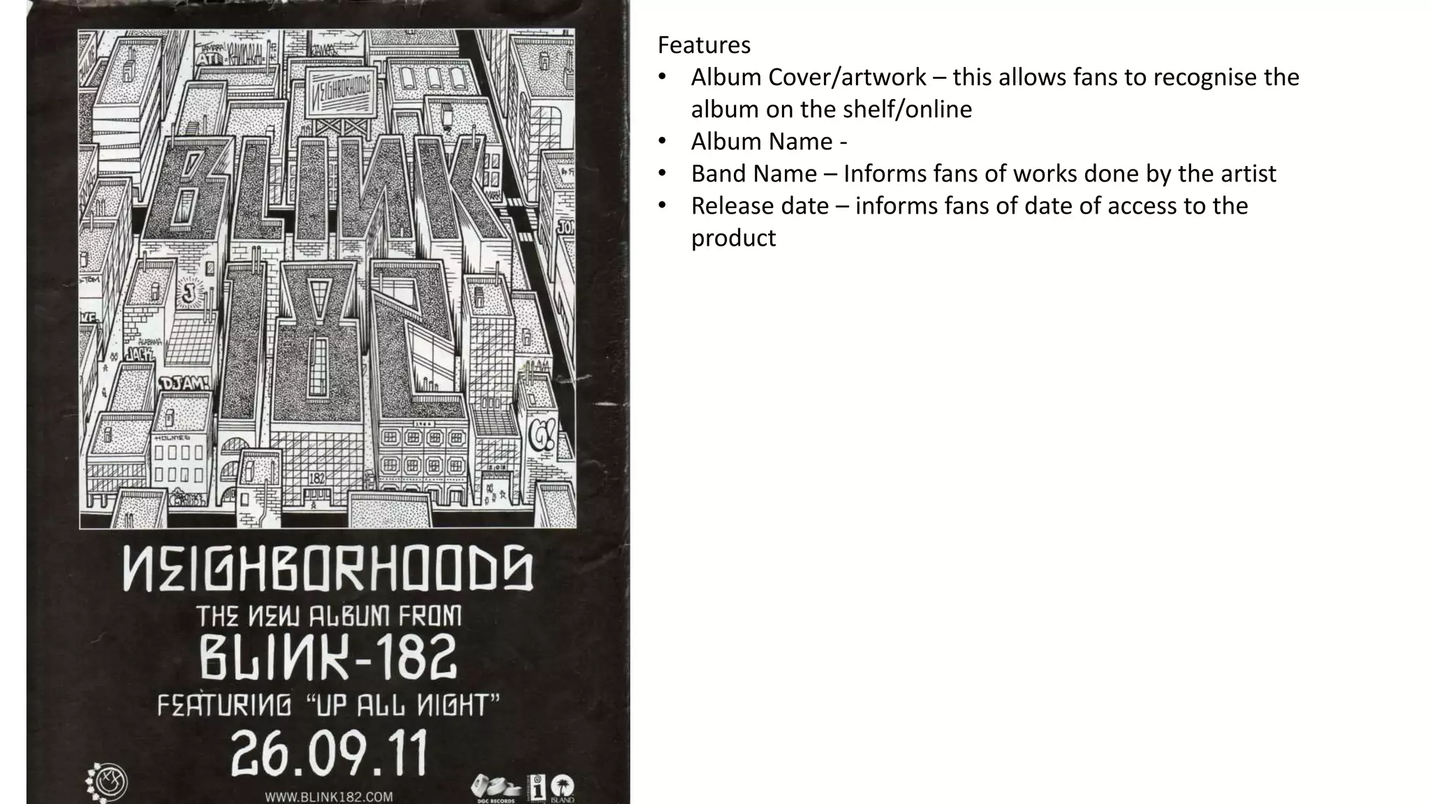 The document lists key features of an album that provide information to fans, including the album cover/artwork which allows fans to recognize the album visually, the band name to identify the artist, and the release date to indicate when the album became available.