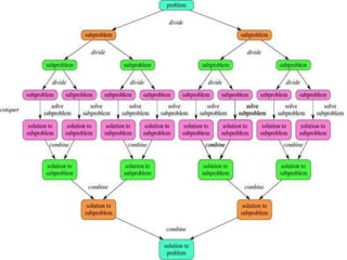 The document discusses the divide-and-conquer algorithm design paradigm. It defines divide-and-conquer as breaking a problem down into smaller subproblems, solving those subproblems recursively, and combining the solutions to solve the original problem. Examples provided include merge sort, quicksort, and the closest pair problem. Divide-and-conquer algorithms have advantages like being well-suited for parallelization and efficient memory usage.