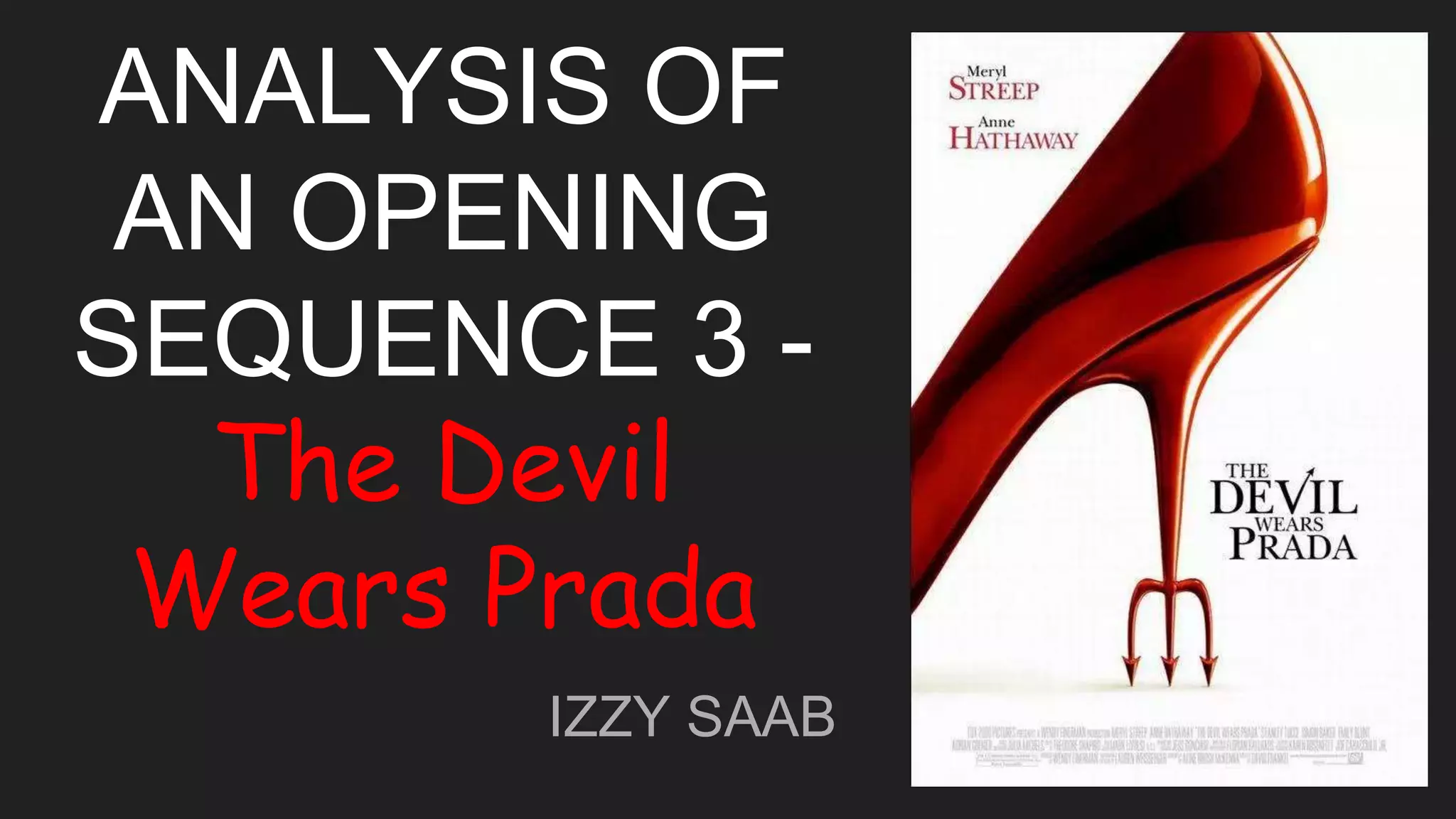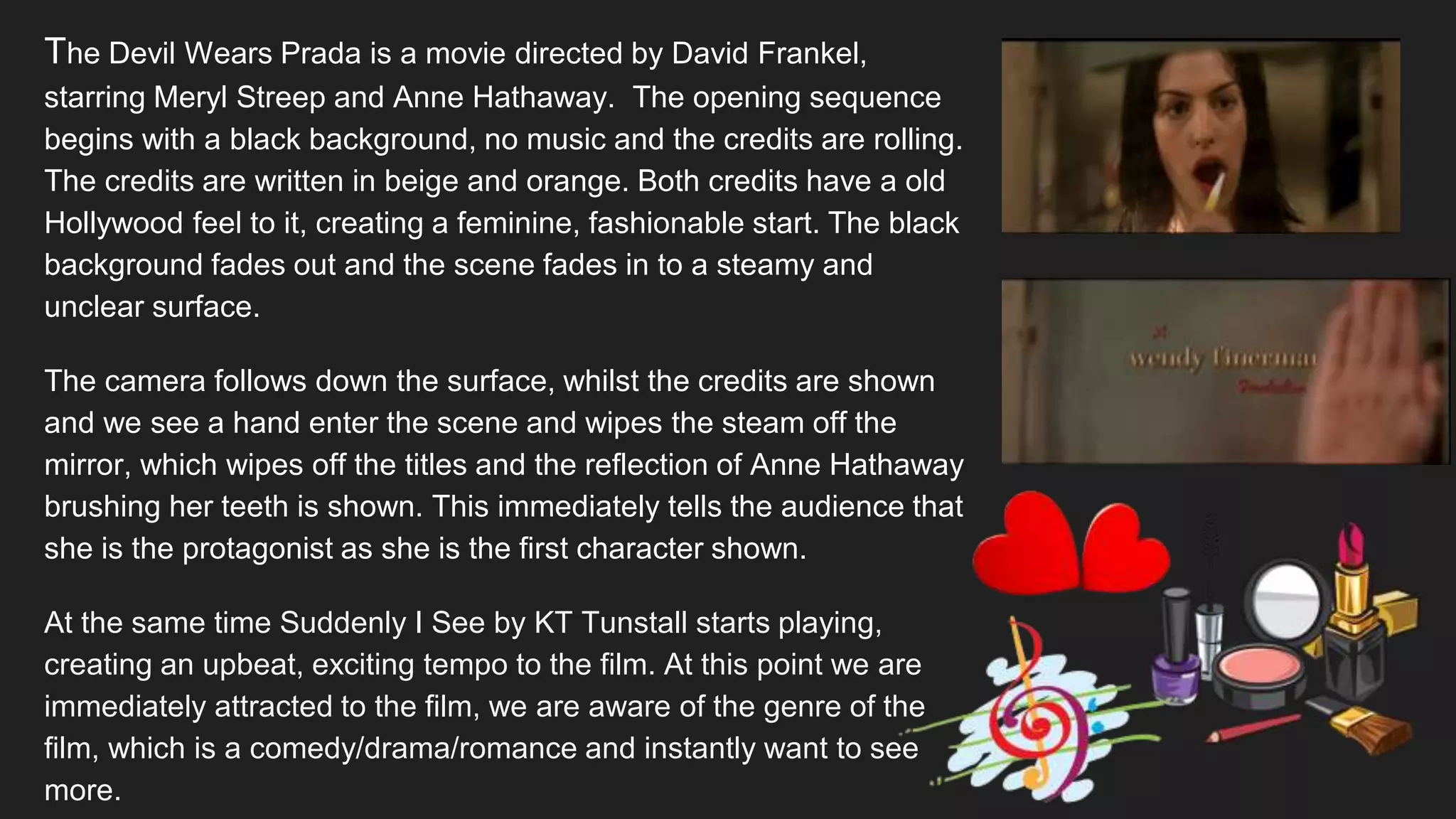 The opening sequence of The Devil Wears Prada begins with credits against a black background with no music. It then shows a hand wiping steam off a mirror, revealing the protagonist Anne Hathaway brushing her teeth. As the song "Suddenly I See" plays, the sequence cuts between shots of New York City and elegant women getting dressed and applying makeup, contrasting with Anne who puts less effort into her routine. The opening ends with Anne entering an office building and taking an elevator, leaving the audience wondering what will happen next.