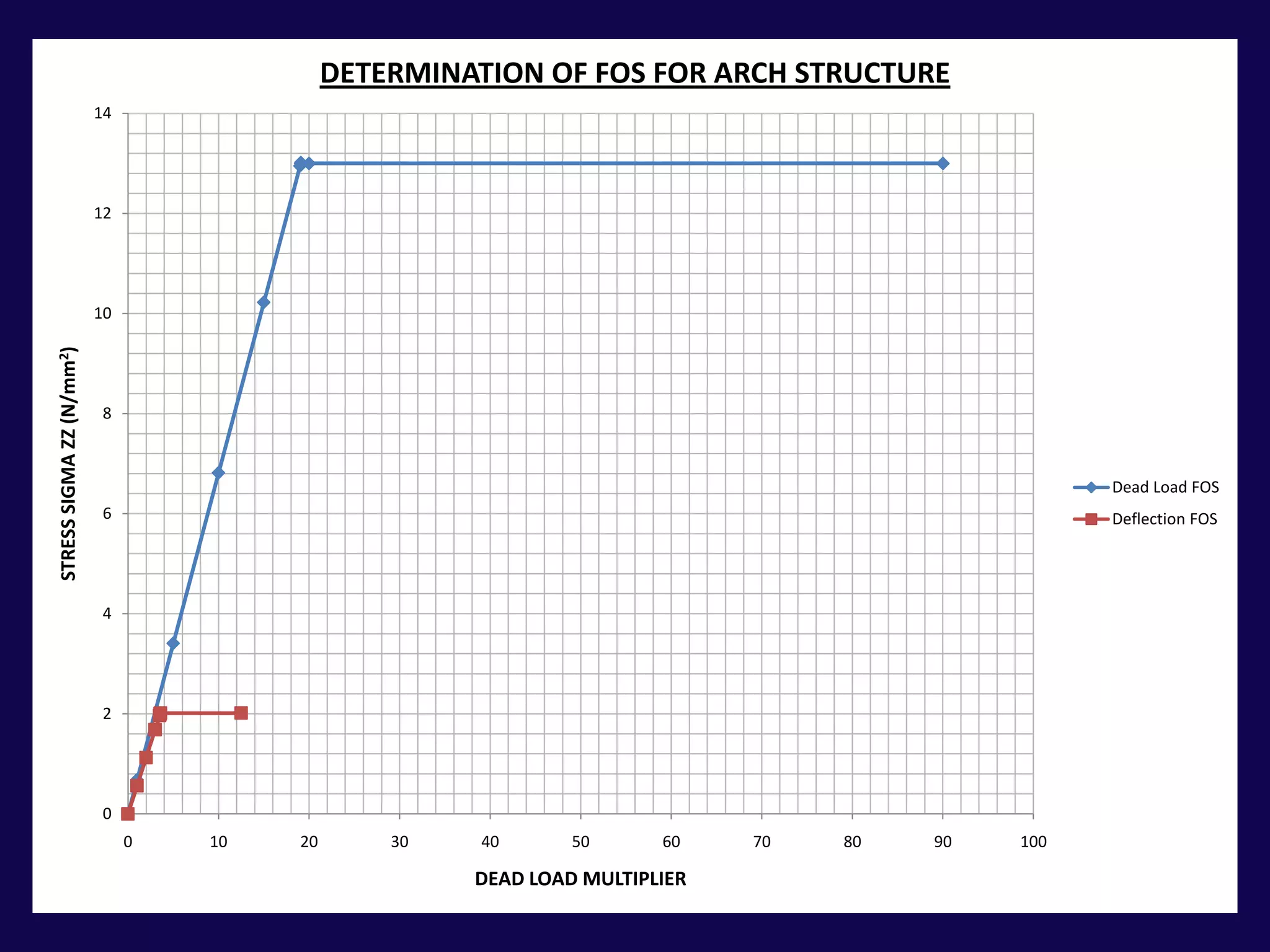 This document analyzes the structural safety of an arch structure using finite element modeling. It makes assumptions about the structure's geometry and the material properties of stone. A shell element model with 6-inch elements is used. Two analyses are performed: (1) for self-weight, the weight multiplier is incrementally increased until failure occurs at 19.072 times the actual weight; (2) for displacement, a boundary condition allows downward movement at the central pier, causing failure in tension at 3.565 times the displacement. The analyses determine safety factors for self-weight and displacement-induced failure modes.