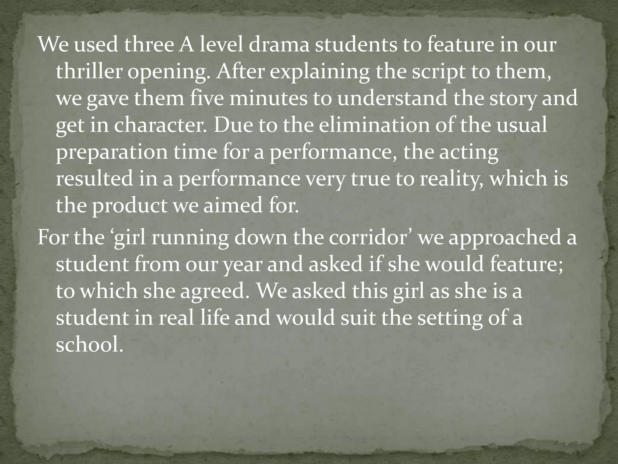 We used drama students to act in our thriller opening without much preparation time. This resulted in a very realistic performance, as we aimed to capture. For the scene of a girl running down a corridor, we used a student from our year since she was a real student who could suit the school setting. Her acting appeared authentic due to the limited preparation.