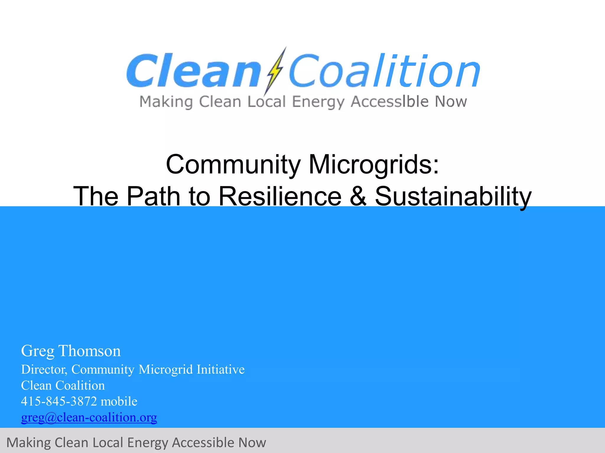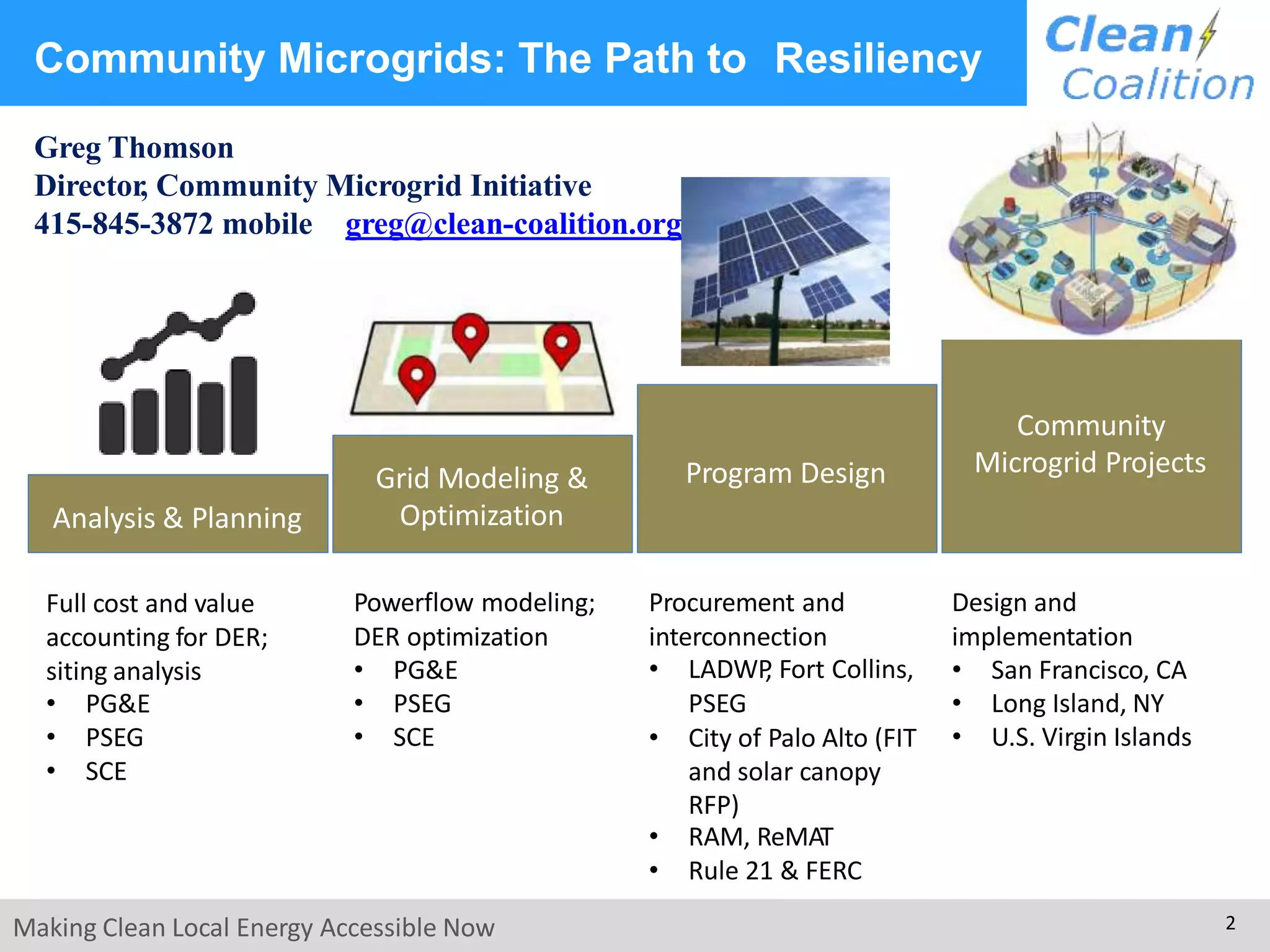 This document discusses community microgrids and their benefits. It begins by introducing Greg Thomson and the Clean Coalition's Community Microgrid Initiative. It then provides an overview of community microgrids, explaining that they can deliver lower costs, cleaner energy, resilience and security, and a replicable solution. The document outlines the design process for community microgrids and provides examples of existing and planned projects in various locations like New York, Long Island, Massachusetts, Vermont, Connecticut, and Minnesota.