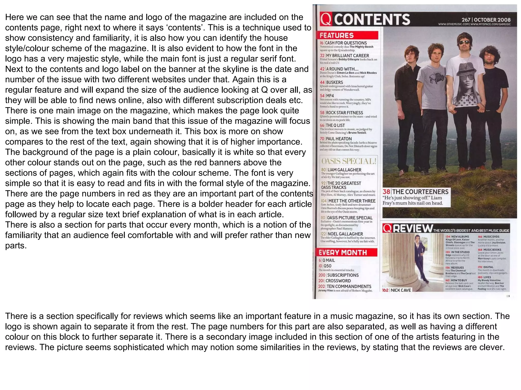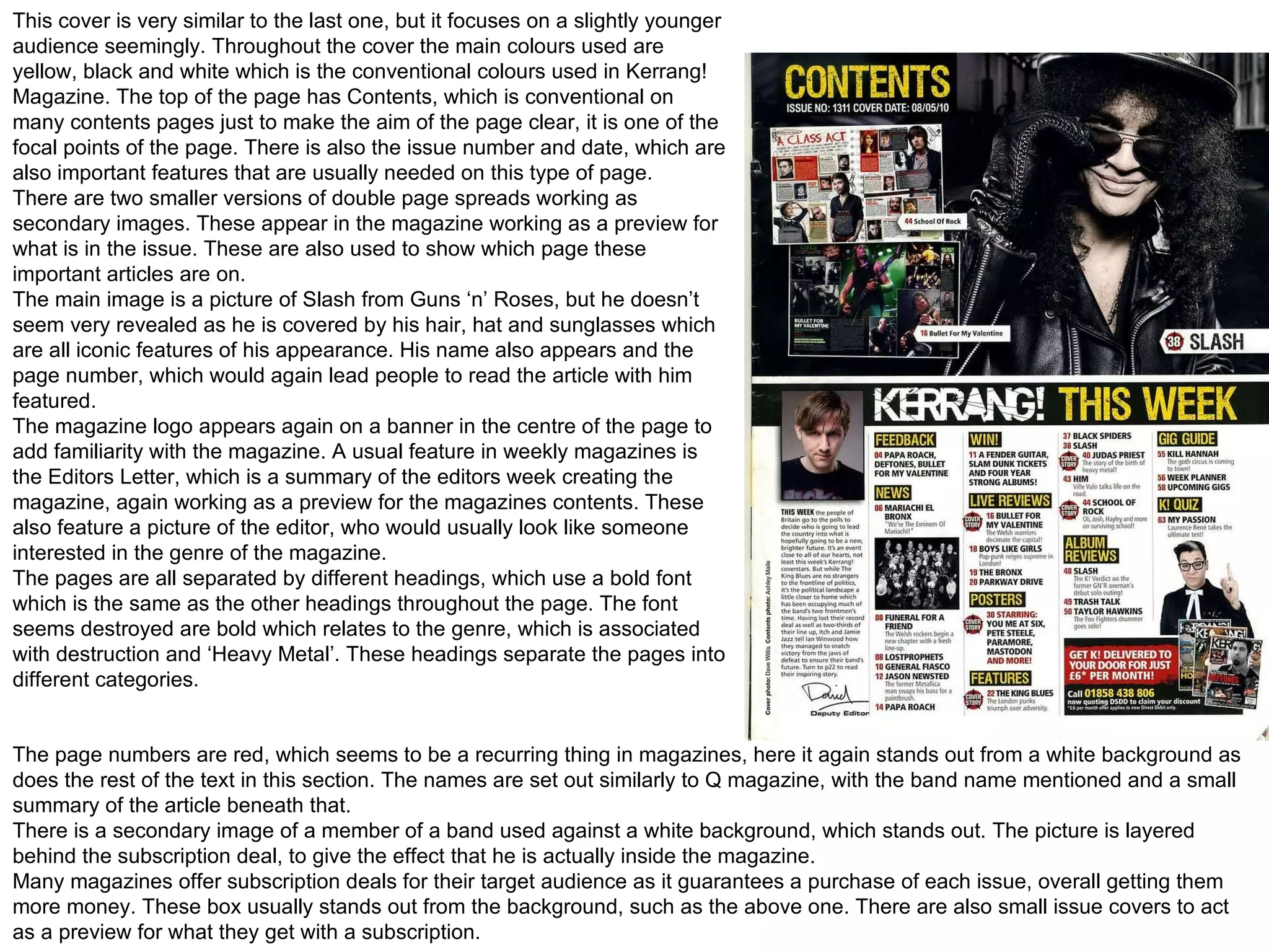 The document summarizes the contents pages of three different magazines - Q Magazine, Kerrang! Magazine, and a gothic/rock-focused magazine. Each magazine's contents page uses consistent branding elements like the magazine logo and date. They provide previews of articles through images and brief descriptions to entice readers. Common sections include editor's letters, reviews, and subscription information. Visual elements like fonts, images, and color schemes are tailored for each magazine's target audience and genre.