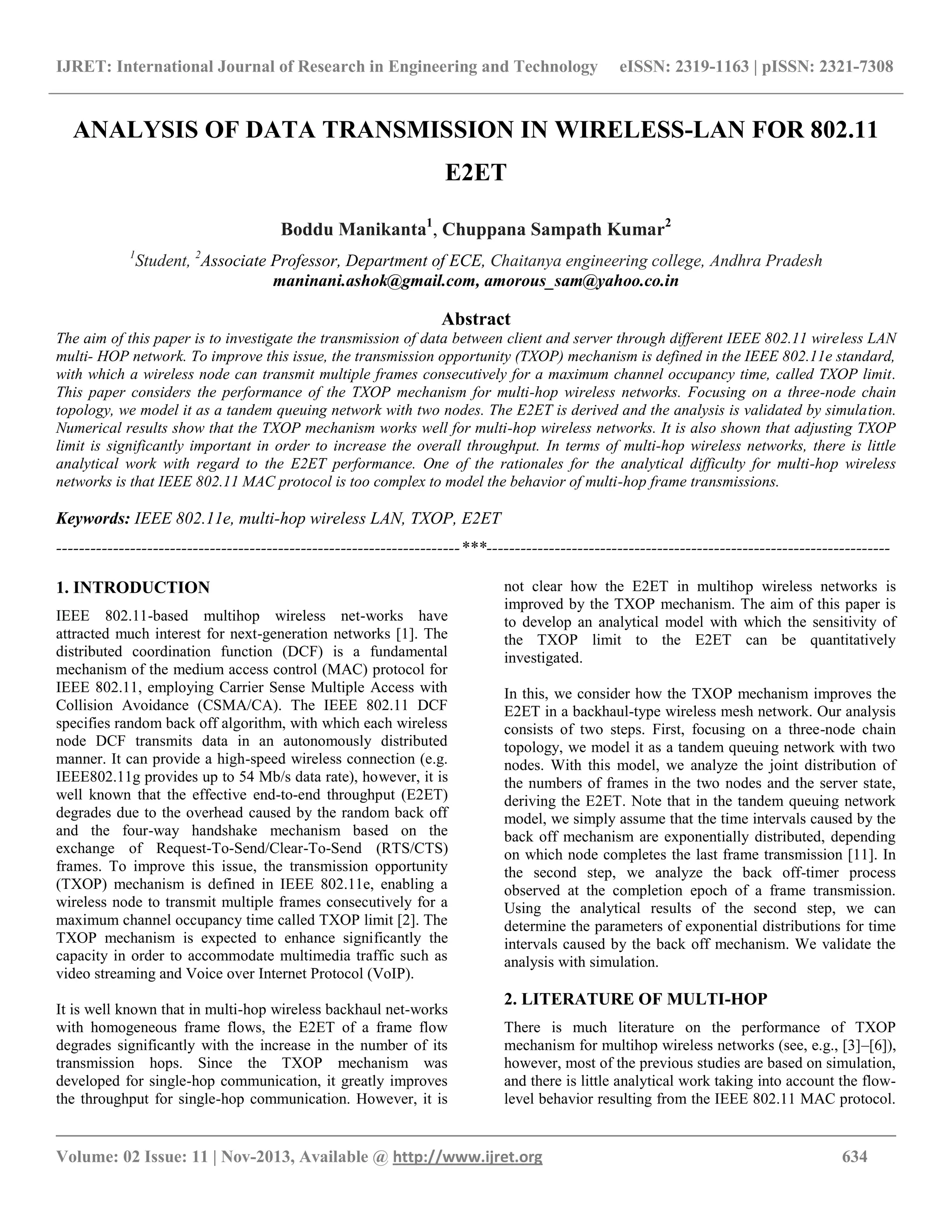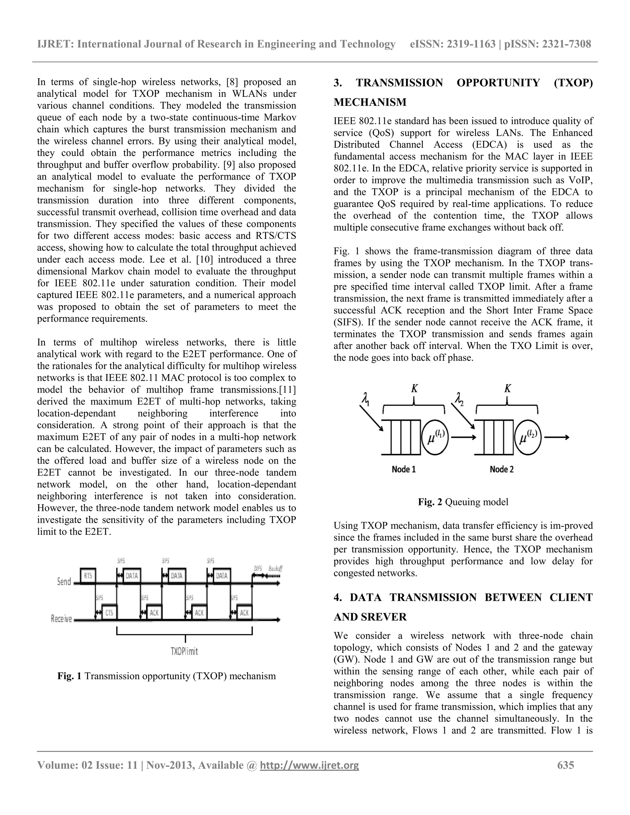 This paper investigates the performance of the transmission opportunity (txop) mechanism in multi-hop wireless networks specified by the IEEE 802.11e standard. It focuses on a three-node chain topology, modeling it as a tandem queuing network and confirming its analysis through simulation, revealing that the txop mechanism can significantly enhance throughput by allowing multiple frame transmissions. However, the paper also notes that a large txop limit can lead to degradation of the end-to-end throughput, emphasizing the need for careful adjustment of txop limits for optimal network performance.