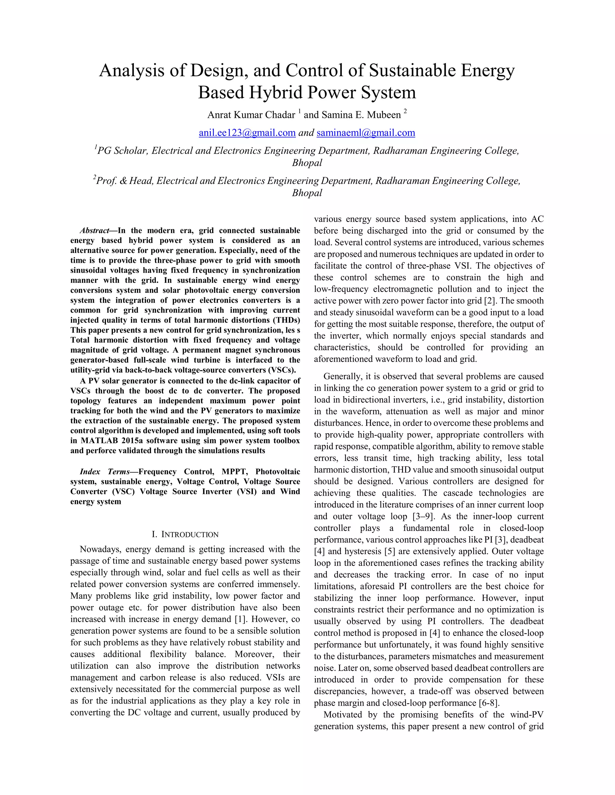 This document presents a new control strategy for grid synchronization of a sustainable energy-based hybrid power system consisting of a wind turbine with a permanent magnet synchronous generator and a photovoltaic solar generator. The wind turbine and solar generator harvest sustainable energy which is converted to electrical power and interfaced to the grid via back-to-back voltage source converters. The control strategy aims to maximize power extraction from both generators while providing smooth sinusoidal voltages to the grid with fixed frequency and minimizing total harmonic distortion. The system and control algorithms are modeled and validated through MATLAB simulations.