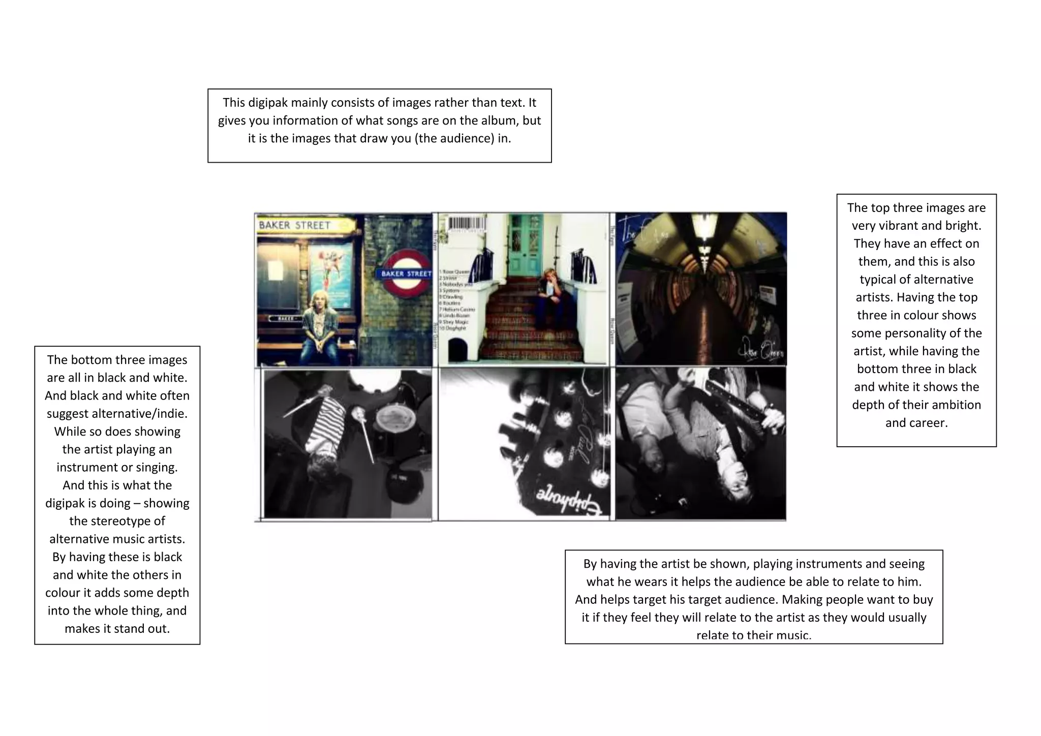 This digipak uses a combination of colorful and black-and-white images of the artist playing music to draw in audiences. The black-and-white shots suggest an alternative or indie style, while the colorful images show the artist's personality. By including pictures of the artist performing, the digipak helps audiences relate to the artist and their music, increasing the likelihood they will purchase the album.
