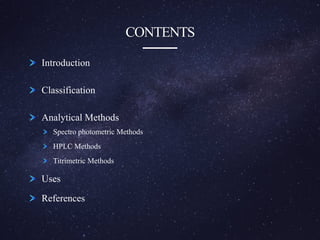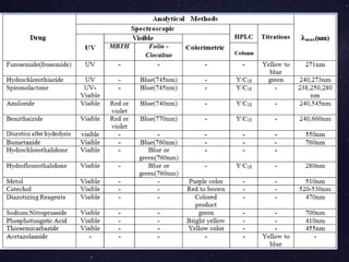 The document is a comprehensive analysis of diuretics, detailing their classification, analytical methods for assessment (including spectrophotometric, HPLC, and titrimetric), and various applications in medical treatments such as high blood pressure and fluid retention. It covers specific examples of diuretics, their mechanisms of action, and experimental methodologies for their analysis using different reagents and solvents. References and methodologies are well-documented, providing a thorough resource for understanding the role of diuretics in pharmacology.