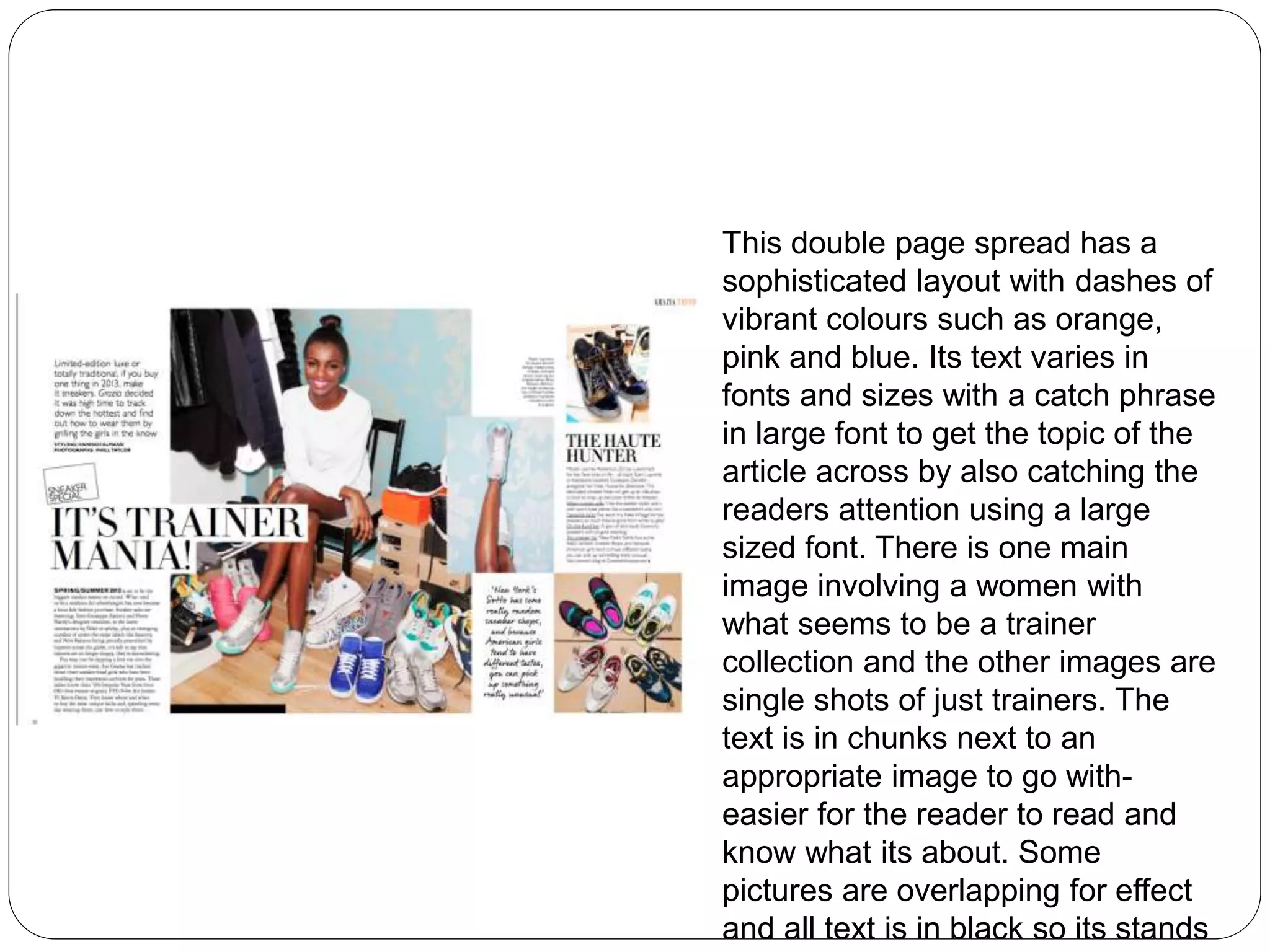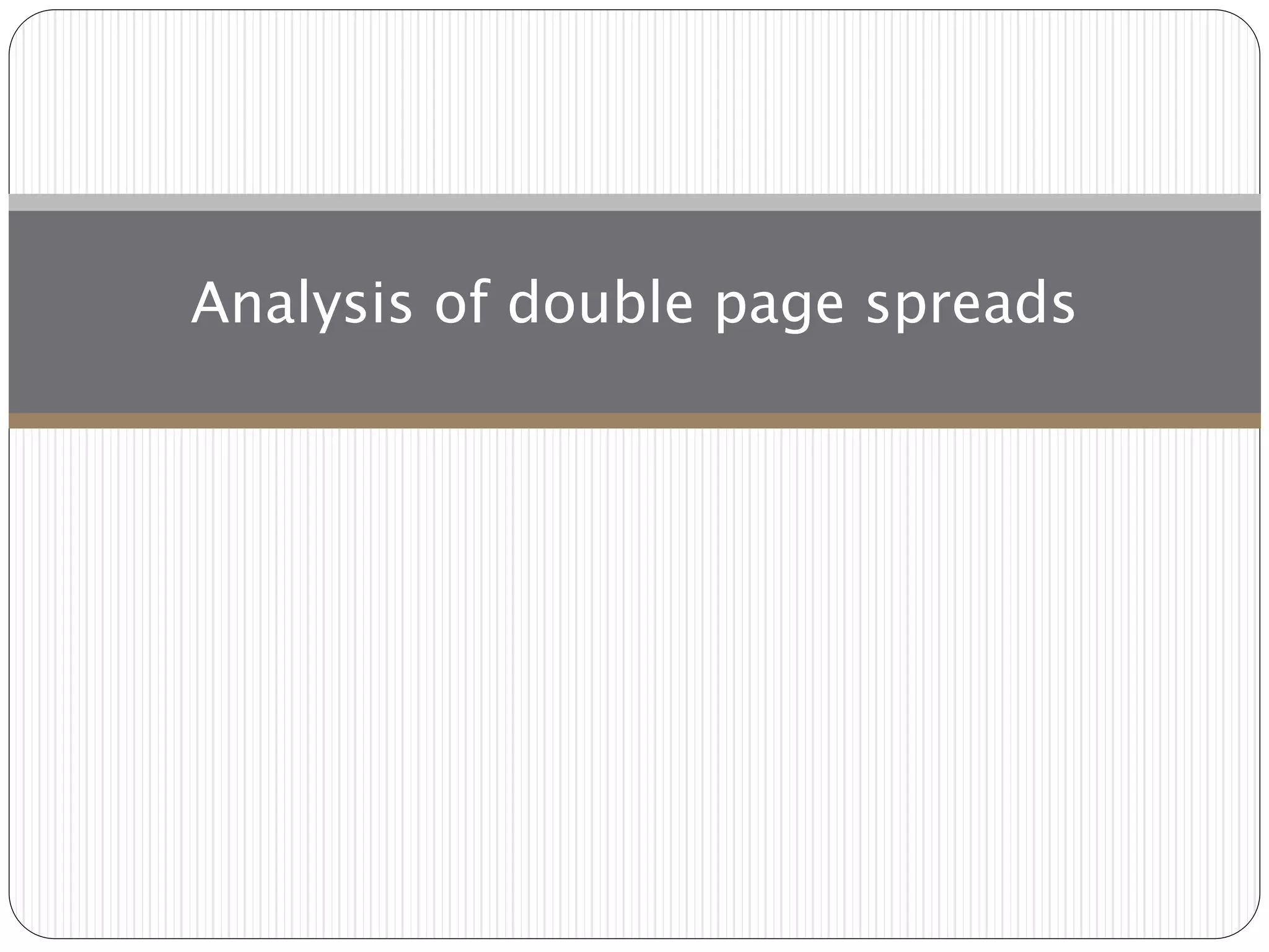 This document contains analyses of several different double page spreads from magazines. The analyses describe the layouts, use of images and text, color schemes, and how effectively the designs convey their intended messages and target audiences. Across the spreads, common effective design elements identified include prominent images, varied use of fonts, columned text formatted around images, and limited color palettes.