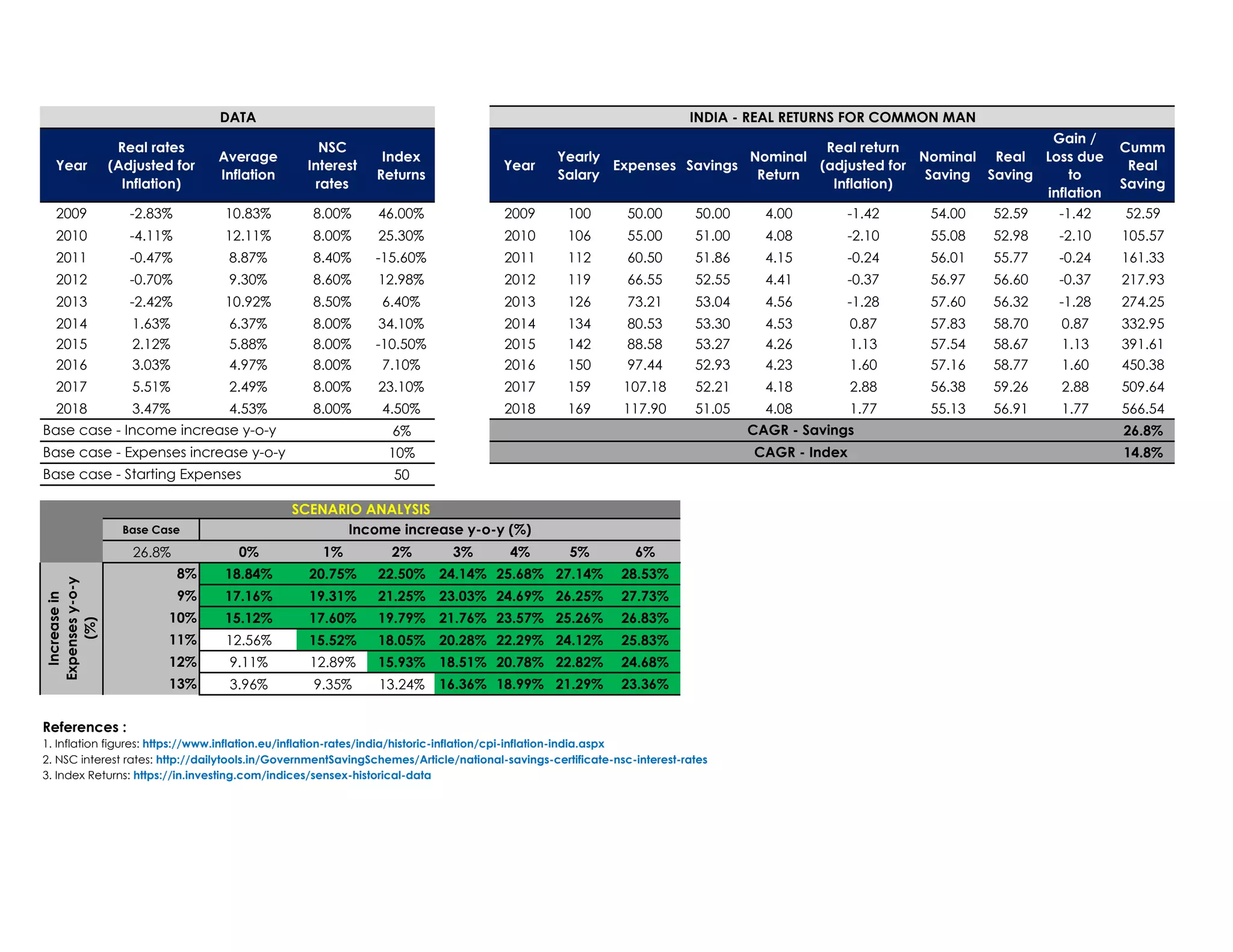 The document presents a detailed financial analysis covering real rates adjusted for inflation, average inflation, NSC interest rates, index returns, and yearly salary alongside expenses and savings from 2009 to 2018. It includes a projection of nominal and real returns, as well as gains or losses due to inflation, providing insights into the impact of inflation on savings over the years. References for inflation figures, NSC interest rates, and index returns are also included for further verification.
