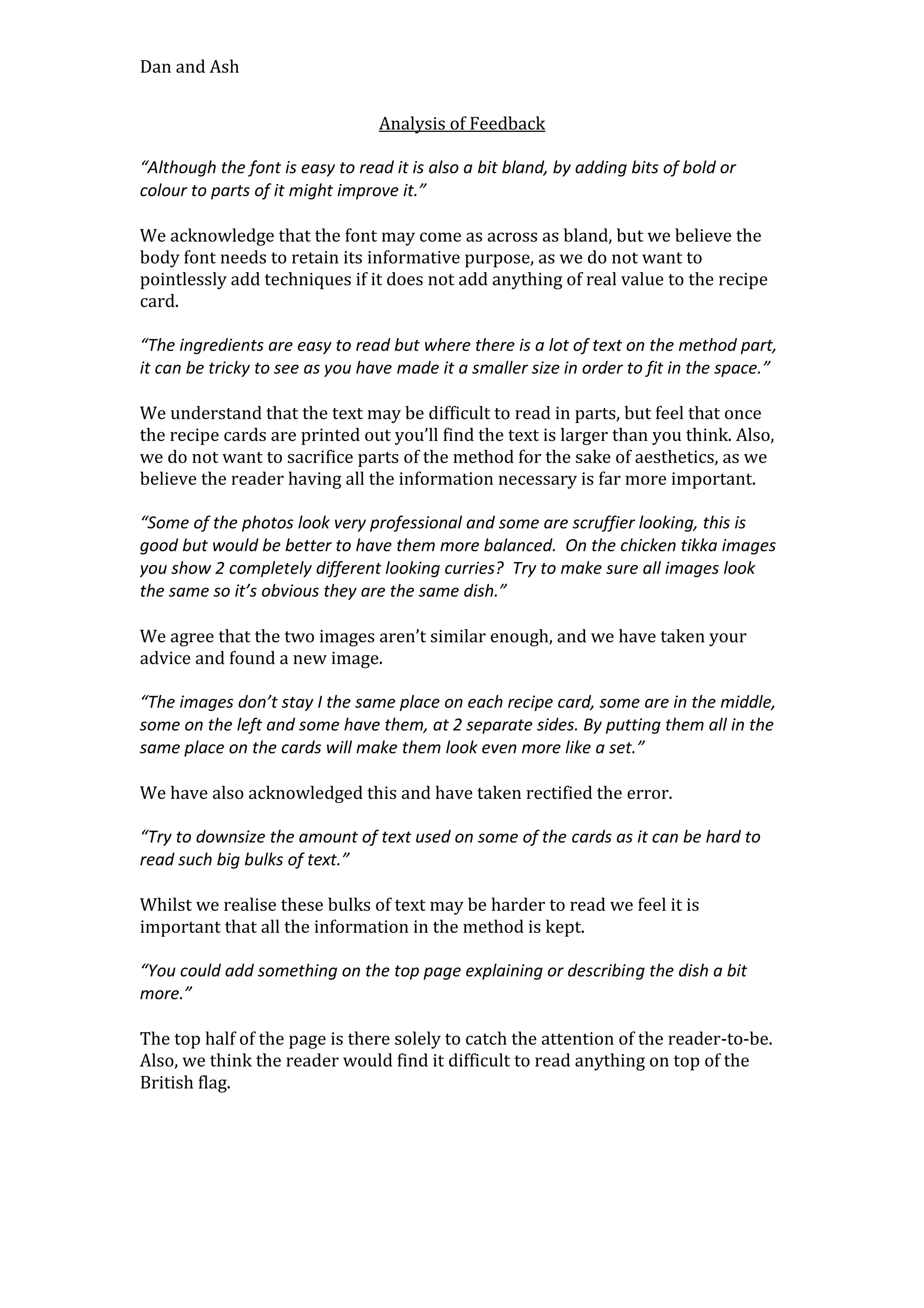 The document provides feedback on recipe cards created by Dan and Ash and their responses. The feedback suggests making the font more interesting, improving readability of dense text sections, balancing photo quality and consistency, standardizing photo placement, reducing text amounts, and adding descriptive text. Dan and Ash acknowledge some points but believe functionality should take priority over aesthetics in other cases, such as retaining all method steps for clarity.
