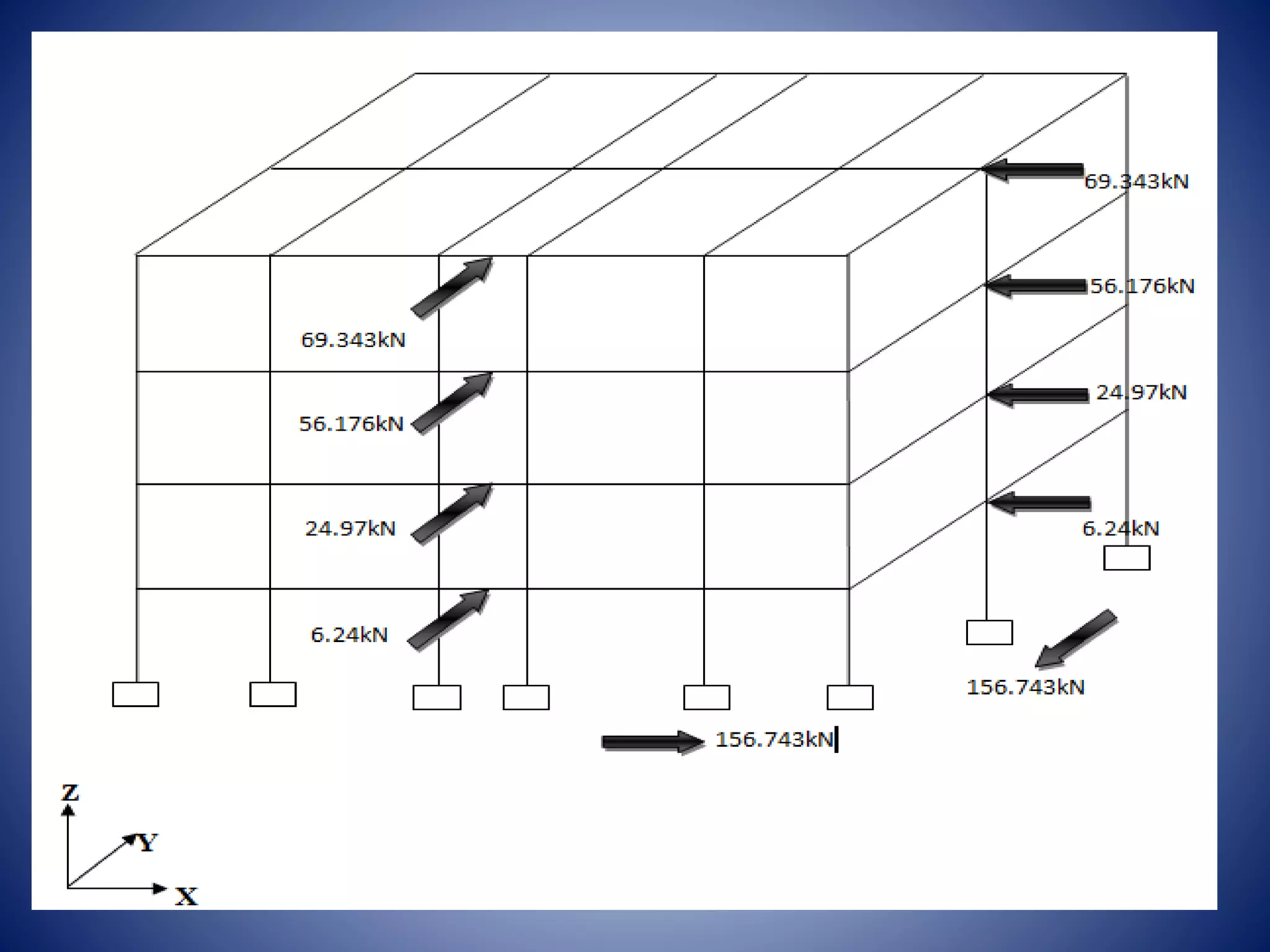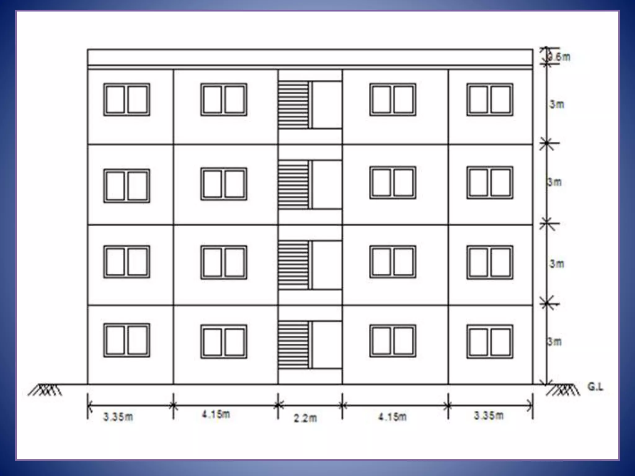 This document provides an analysis and design of a G+3 residential building. It includes details of the building such as dimensions, material properties, and load calculations. An equivalent static analysis is performed to calculate the seismic lateral loads at each floor level. The results of the structural analysis including bending moment and shear force diagrams are presented. Slab, beam, column and footing designs are to be covered in the thesis work according to the scope.