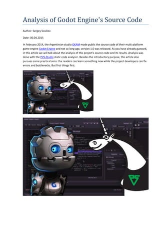 The document analyzes the source code of the Godot game engine using the PVS-Studio static code analyzer. It finds and discusses several types of errors identified by the analyzer, including duplicated comparisons, array overruns due to enum/array mismatches, incorrect data type checks, typos causing logic errors or infinite loops, and unsafe pointer usage. The analysis aims to both introduce readers to the Godot project and help its developers fix bugs and improve code quality.