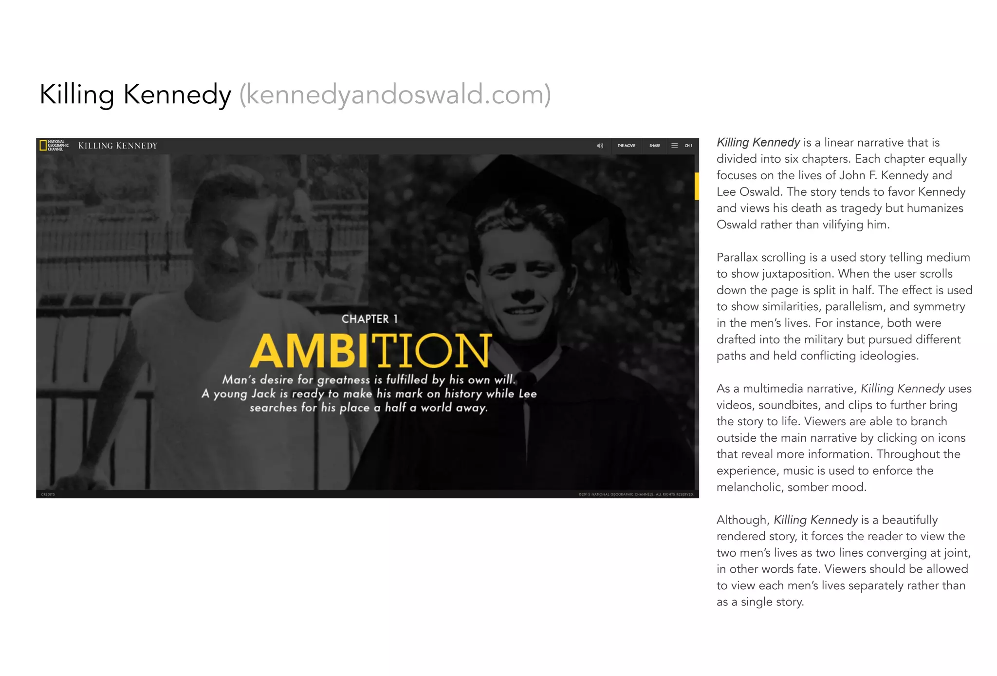 Killing Kennedy uses parallax scrolling and multimedia to tell the parallel stories of John F. Kennedy and Lee Harvey Oswald. It focuses equally on both men but views Kennedy's death as a tragedy.