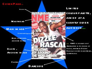The document analyzes the target audiences and design elements of two magazines - NME and Classic FM. NME mainly targets 16-24 year old males, especially those interested in alternative music. It uses a limited color palette and alternative music choices to appeal to this audience. Classic FM targets an older, more sophisticated audience with its classical music focus, serious fonts and simple color schemes without bright colors. It aims to provide a refined experience for its readers.