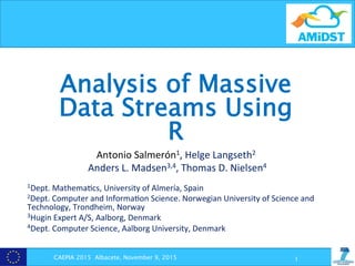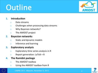 The document discusses the analysis of massive data streams using Bayesian networks, highlighting the challenges in processing data streams and the scalability issues involved. It emphasizes the AMIDST project, which employs hybrid Bayesian networks for real-time data analysis, and introduces the RAMIDST package as a toolbox for such purposes. Additionally, the document outlines the structure of Bayesian networks, including their application in event detection through sensor data analysis.