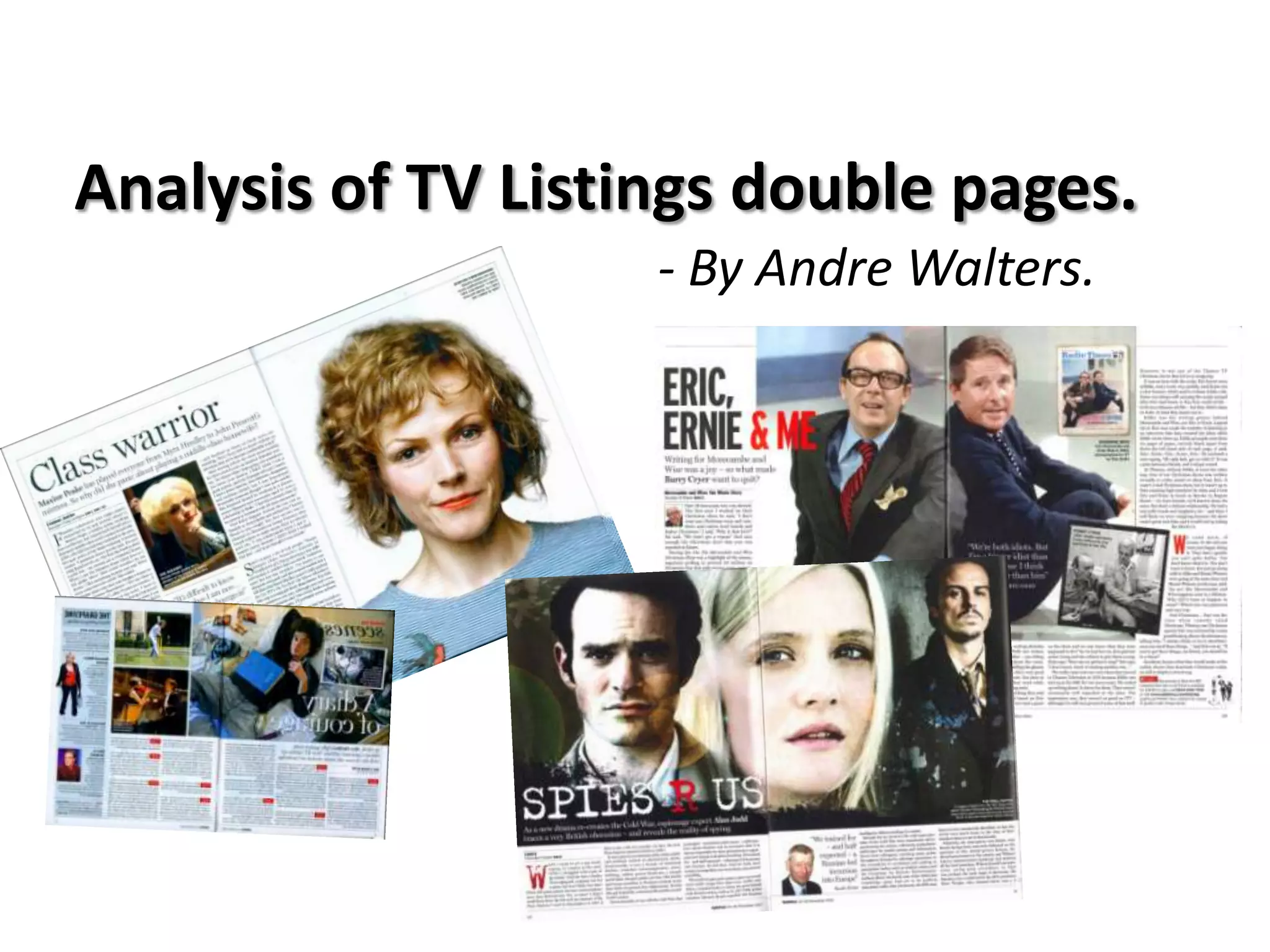 This document analyzes conventions used in TV listings double page spreads. It identifies common elements like titles, drop caps, captions, broadcast details, bylines, and page numbers. It also examines layouts using columns and the purpose of elements like pull quotes and stand firsts. The document concludes that the analysis has improved the author's understanding of double page styles, though they note TV listings styles may differ from magazines. The author and their group will now discuss the appropriate style for their documentary double page spread on violent crime.