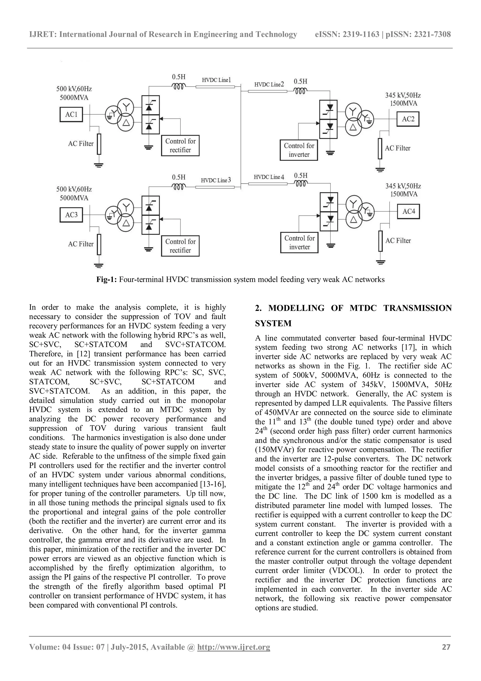 The document discusses a multi-terminal HVDC transmission system utilizing line commutated converters that connects to very weak AC networks with hybrid reactive power compensators. The study emphasizes the performance analysis of different combinations of compensators under various fault conditions and demonstrates the superior transient response using a firefly algorithm-based optimal PI controller compared to conventional methods. Simulation results show improved temporary overvoltage suppression and fault recovery capabilities when employing hybrid compensators.