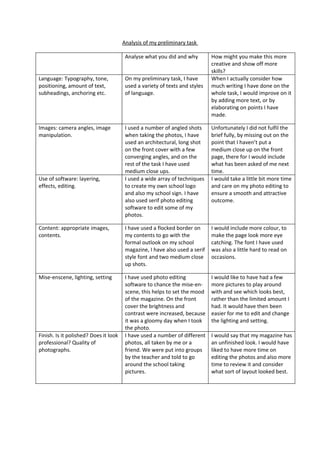 The document analyzes the author's preliminary task of creating a school magazine. For each element - language, images, software use, content, mise-en-scene, and finish - the author reflects on what they did and how they could improve. The author used a variety of text styles and angles in photos but could have added more text or elaborated more. Editing software was used to manipulate photos and create the logo, but more care and time could have been spent on photo editing. Overall, the magazine had an unfinished look and the author wishes for more time and resources to refine and polish the final product.