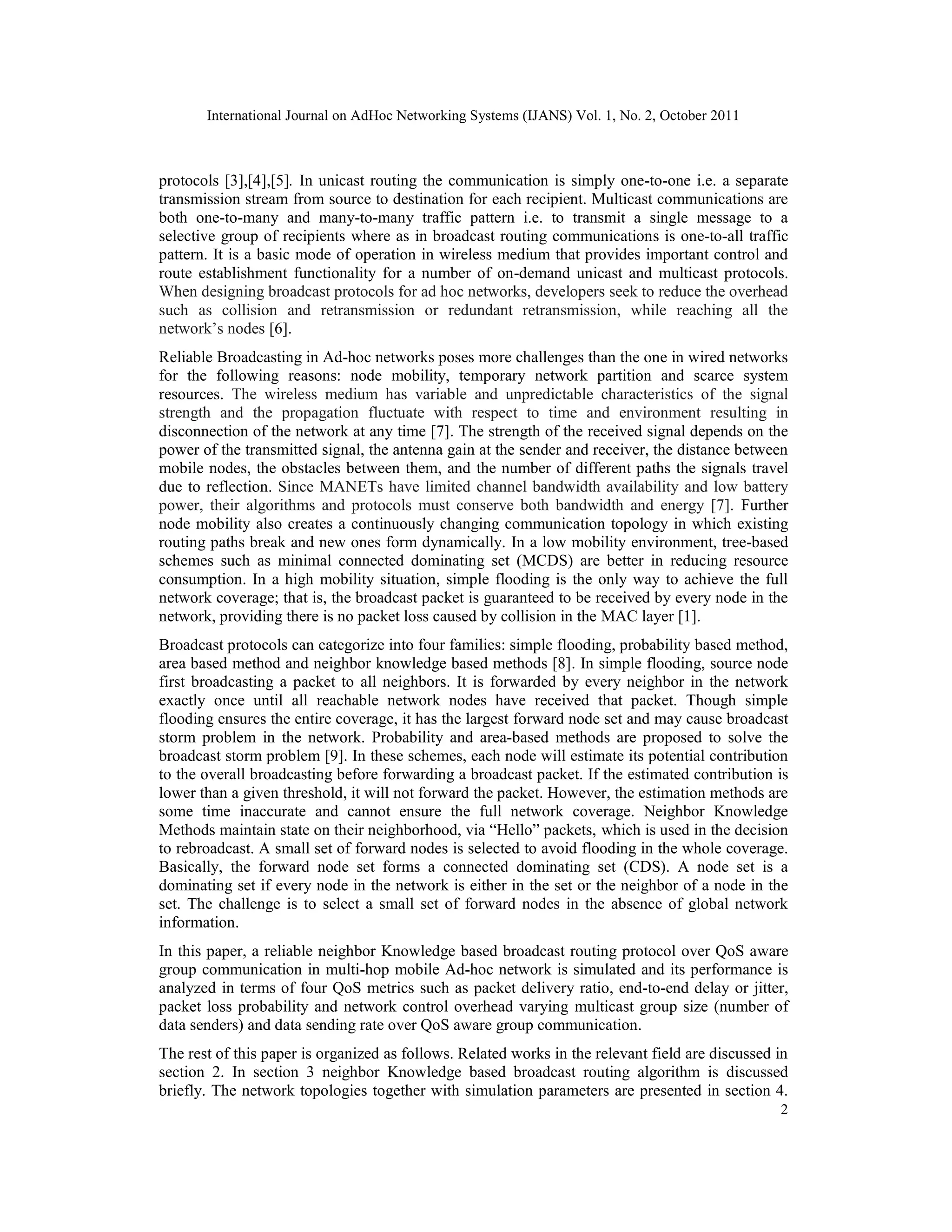 This document analyzes the performance of a neighbor knowledge based broadcast protocol called BCAST in mobile ad hoc networks using network simulator NS-2. It varies the number of data senders (multicast group size) and data sending rate to analyze packet delivery ratio, end-to-end delay, packet loss probability, and network control overhead. The simulation results show that BCAST generally performs well and provides robust performance even with high traffic loads.