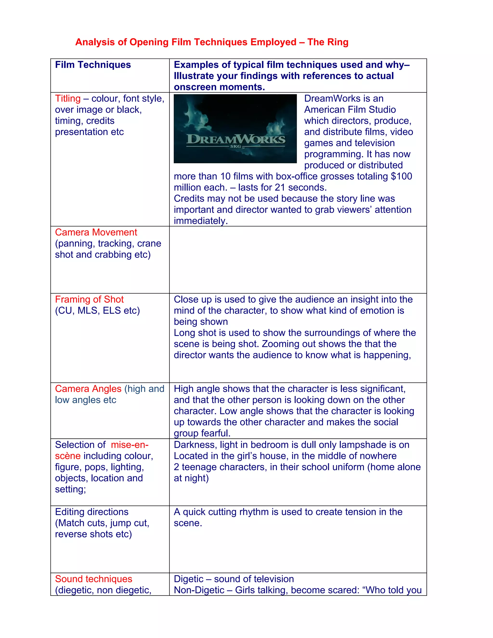 The summary analyzes the opening scenes of the film "The Ring" through three sentences: