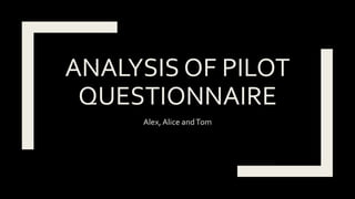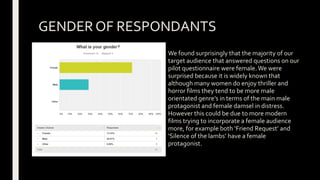 This document analyzes the results of a pilot questionnaire about thriller film preferences. It finds that most respondents were female, between 16-19 years old, and preferred romantic comedies and psychological thrillers. Respondents also favored a strong independent female lead character and plots that are slowly revealed and leave viewers questioning. The document concludes that an effective thriller plot should include unexpected elements and twists to shock and intrigue the audience.