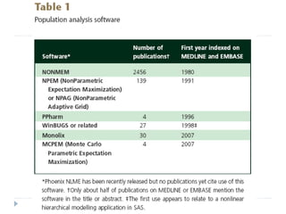 The document discusses population pharmacokinetic (PK) analysis. Population PK seeks to identify factors that cause variability in drug concentrations among patients and quantify their effects to help determine appropriate dosages. It describes common PK parameters, software used for PK analysis like NONMEM, and approaches for analyzing population PK data, including nonlinear mixed-effects modeling. An example population PK analysis is provided using simulated gentamicin concentration-time data from 30 patients to illustrate modeling the typical response, heterogeneity between individuals, and uncertainty in the model.