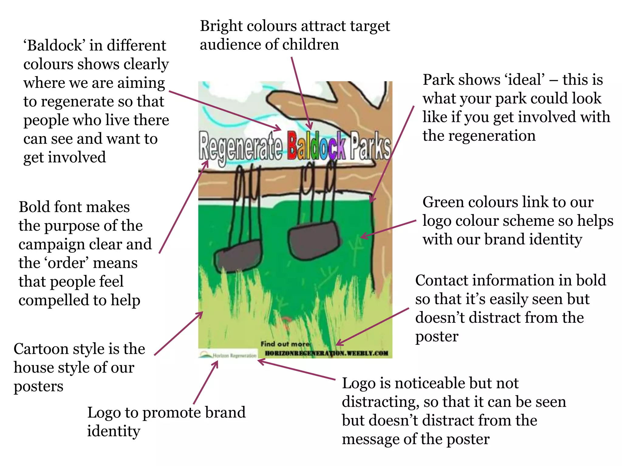 The document provides guidance on design elements for posters promoting a park regeneration campaign. It recommends using bright colors and cartoon styles to attract children and families. Specific elements like logos, contact information, and images of ideal parks should promote the brand identity while clearly communicating the campaign's purpose of encouraging community involvement to regenerate local parks. Emotive language like "save" and images of happy children are meant to compel the audience to get involved and help keep parks vital for childhood.