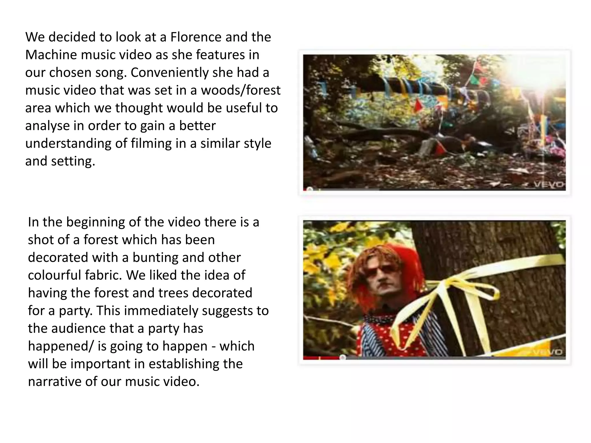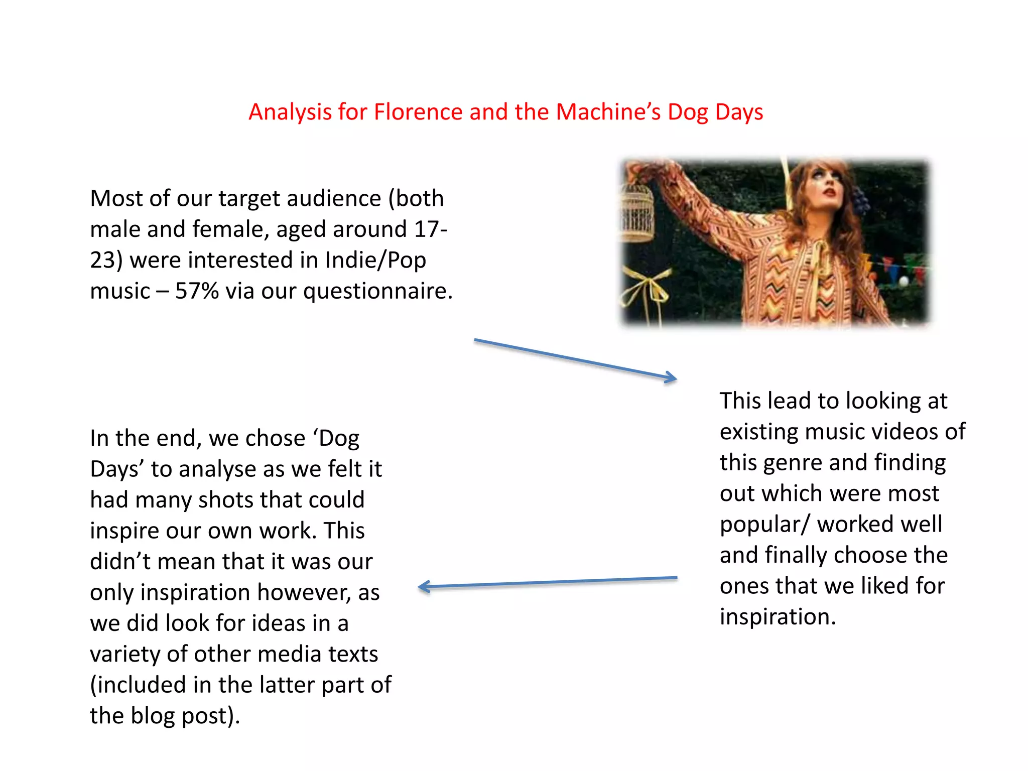 The document analyzes Florence and the Machine's music video for "Dog Days" to gain inspiration for creating their own music video. Key shots and editing techniques from the video are discussed, such as decorated forest scenery, circular shots of Florence, and changes in shot speed to match the music. Lighting, pacing of shots, and using scenery to create interesting shots are also examined. The conclusion emphasizes reflecting the song's pace and emotions through editing speed, shot timing, intentional night filming, and lighting choices.