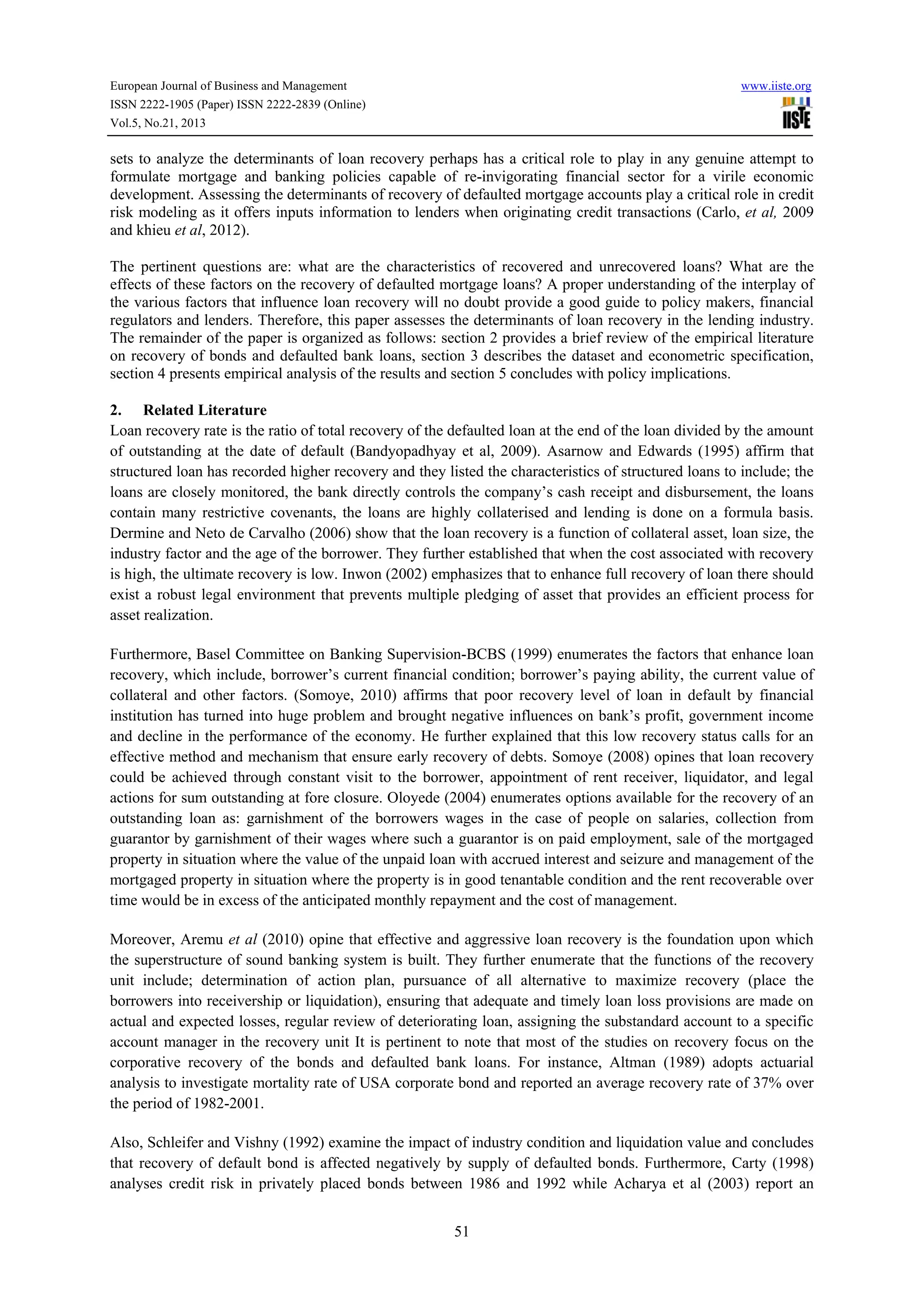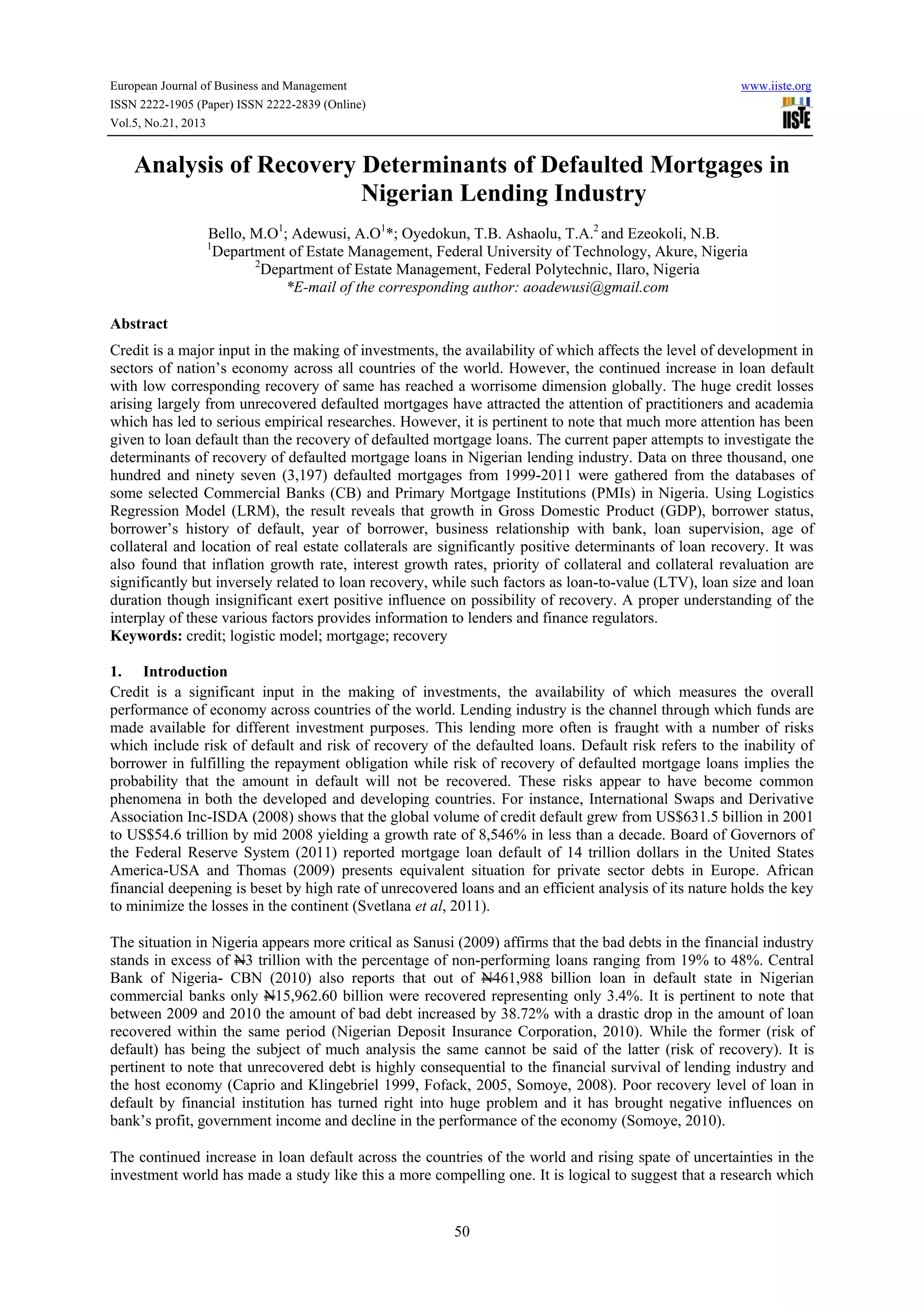 This document summarizes a research paper that analyzed the determinants of recovery of defaulted mortgage loans in the Nigerian lending industry. The study used logistic regression analysis on data from 3,197 defaulted mortgages from 1999-2011 at commercial banks and primary mortgage institutions in Nigeria. The results showed that GDP growth, borrower status, borrower default history, year as a borrower, bank relationship, loan supervision, collateral age, and collateral location were positively associated with loan recovery rates. Meanwhile, inflation growth, interest rates, collateral priority, and collateral revaluation were negatively associated with recovery rates. Other factors like loan-to-value ratio, loan size, and loan duration had insignificant but positive effects on recovery possibility.