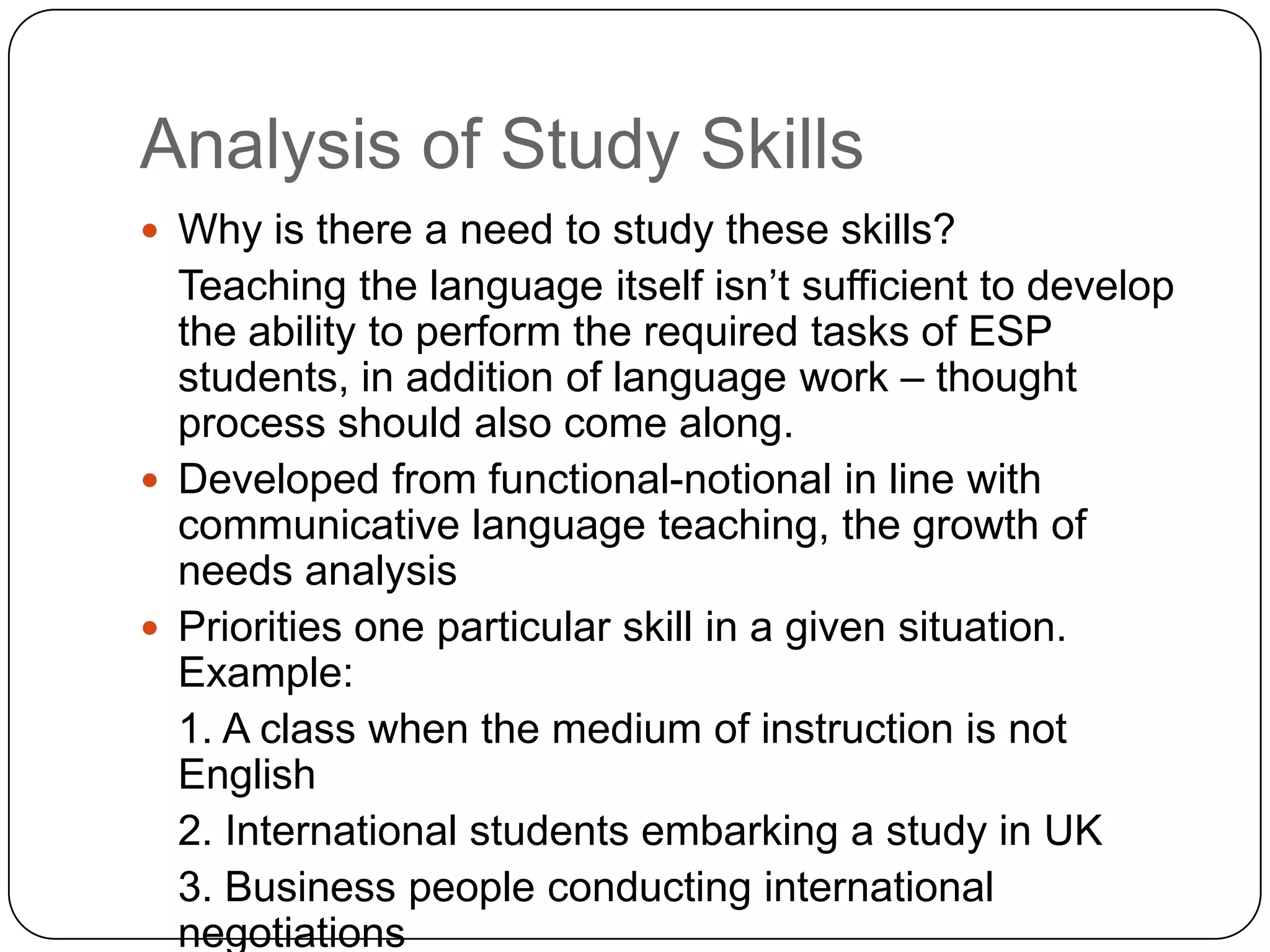 This document summarizes and analyzes various approaches to studying skills for language learning, including: