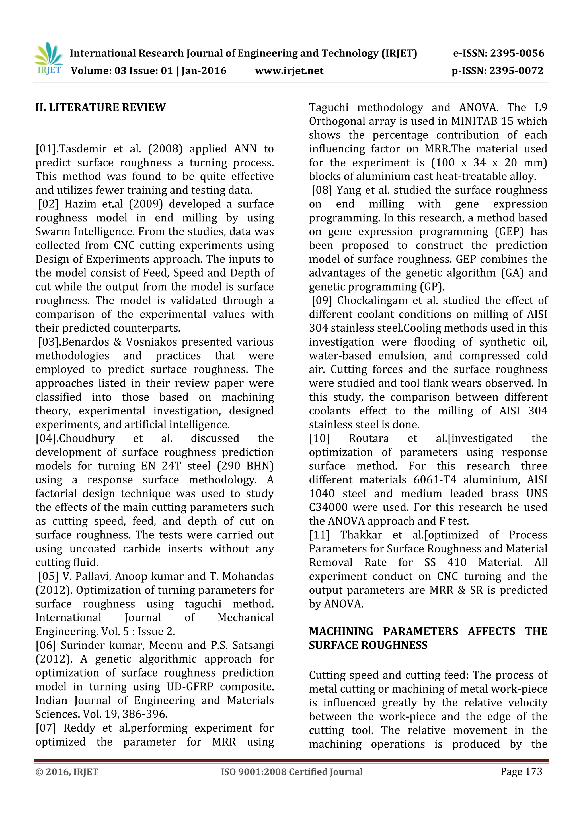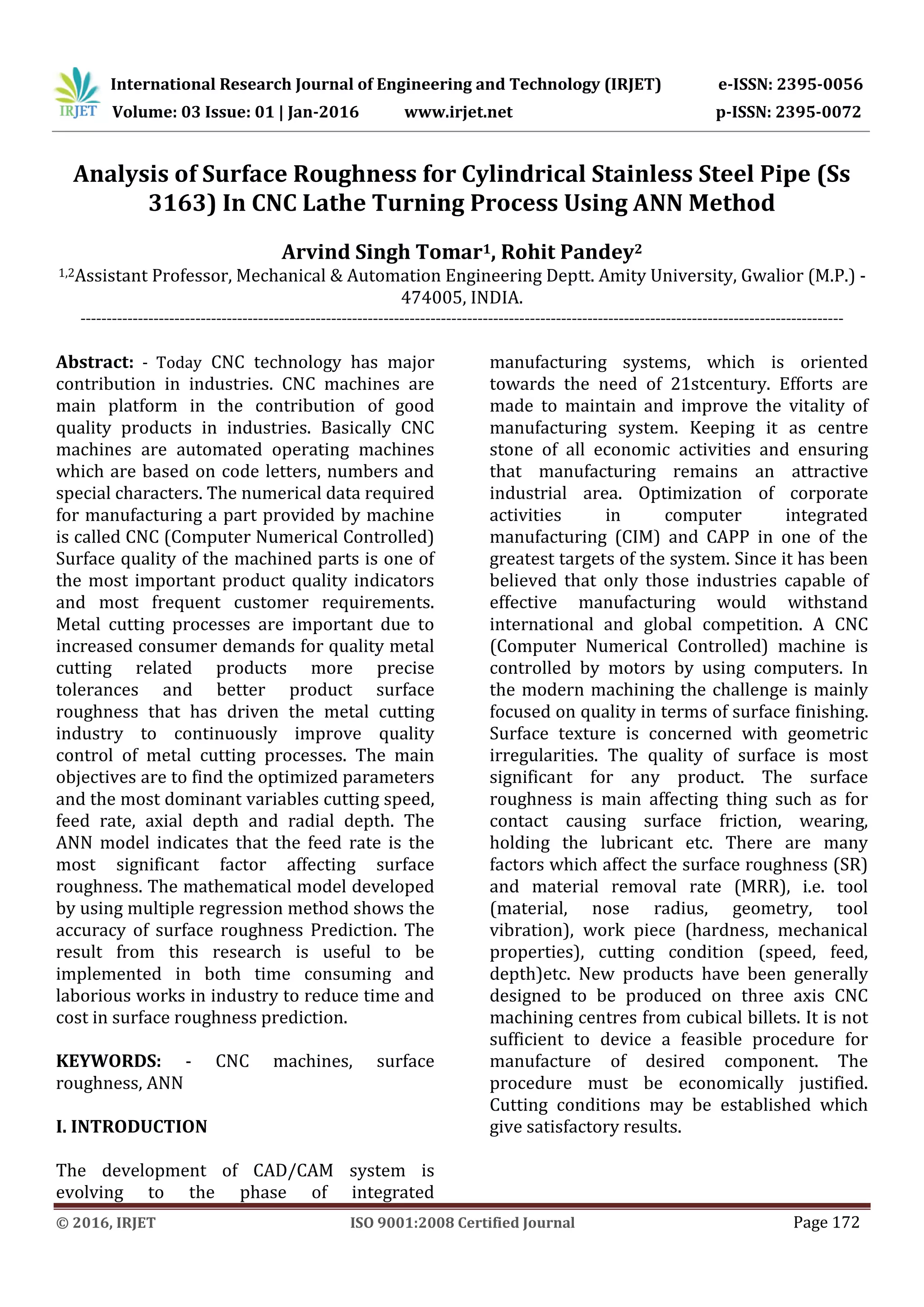 This document discusses using artificial neural networks (ANN) to predict surface roughness in cylindrical stainless steel pipes machined using CNC lathe turning. Surface roughness is an important quality metric that is influenced by machining parameters like cutting speed, feed rate, depth of cut, and tool geometry. The document reviews previous research applying ANN and other methods to model surface roughness. It then describes an experiment using ANN to develop a model relating machining parameters to surface roughness measured from turning 316L stainless steel pipes on a CNC lathe. The results indicate ANN is an effective method for accurately predicting surface roughness based on cutting conditions.