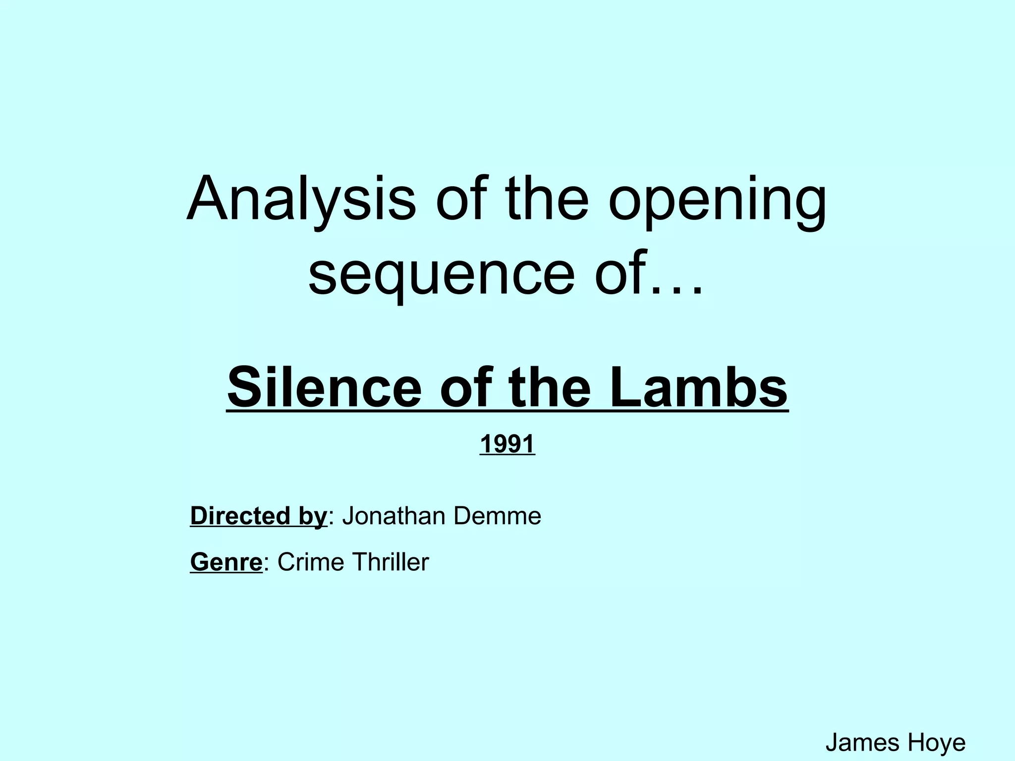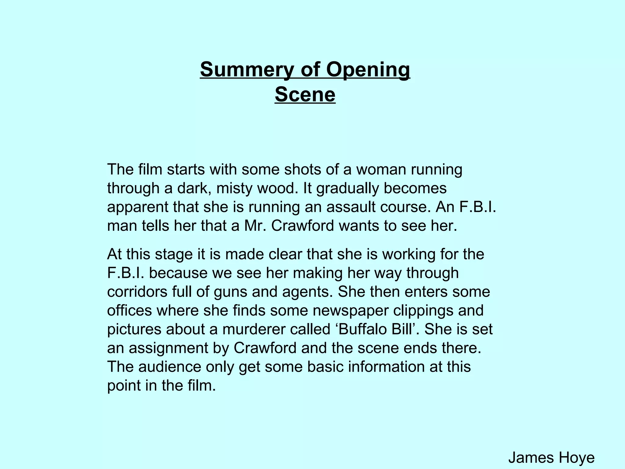 Clarice Starling is seen running through misty woods during an FBI assault course. She is called to meet with Mr. Crawford who assigns her the case of Buffalo Bill, a serial killer. Newspaper clippings and photos of his victims are shown. Starling stands out as a woman in a male-dominated FBI environment. The opening establishes mysteries around Starling's assignment and Buffalo Bill while using lighting, music and cinematography to build tension.