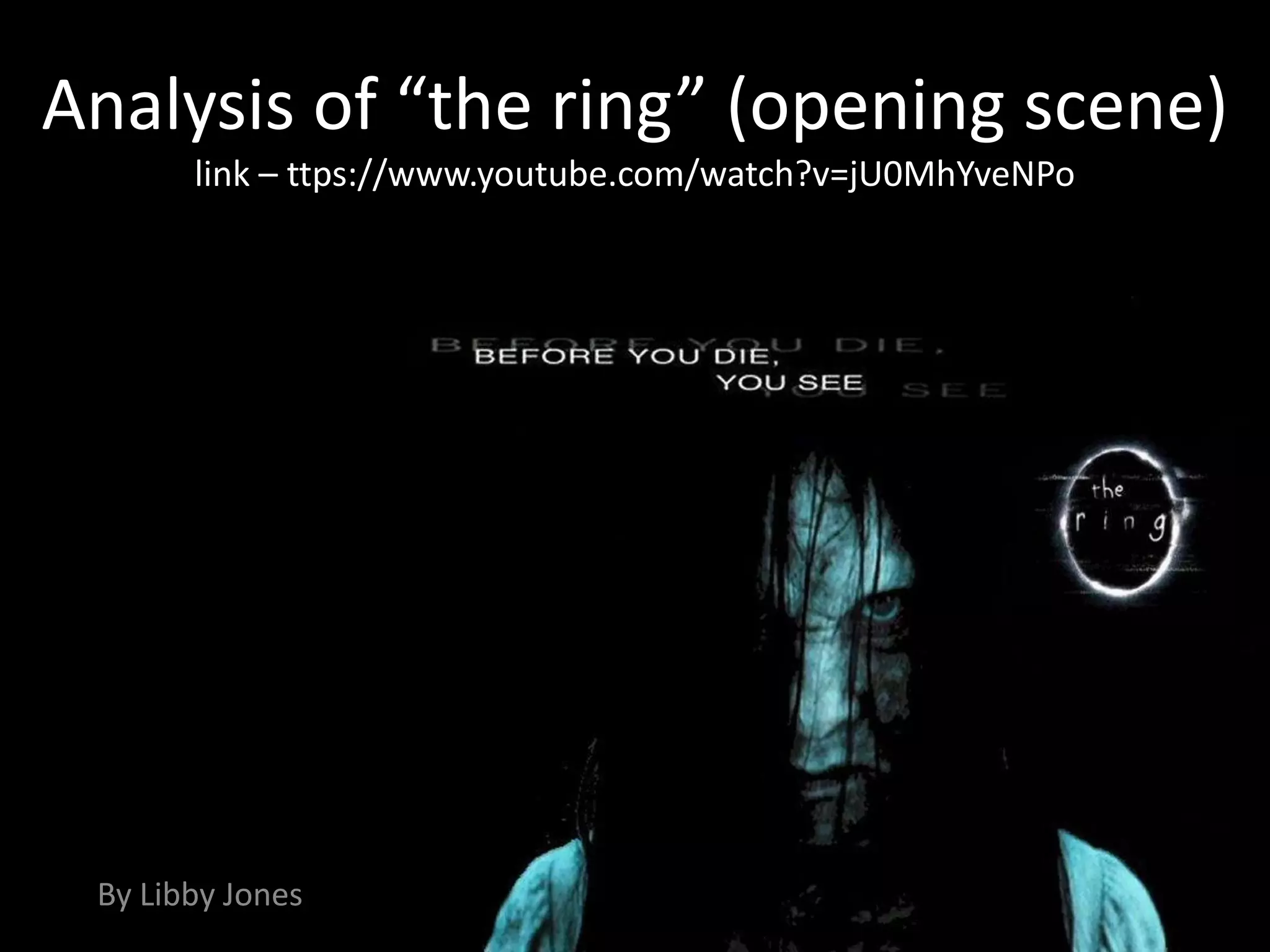 The document analyzes the opening scene of the film "The Ring" in order to understand how it creates suspense through camera angles, editing, and sound. Key techniques discussed include the use of dark lighting, shot reverse shot, close-ups, building tension with strange sounds, and false alarms. Analyzing this film helps understand how to effectively shoot and edit a horror film.