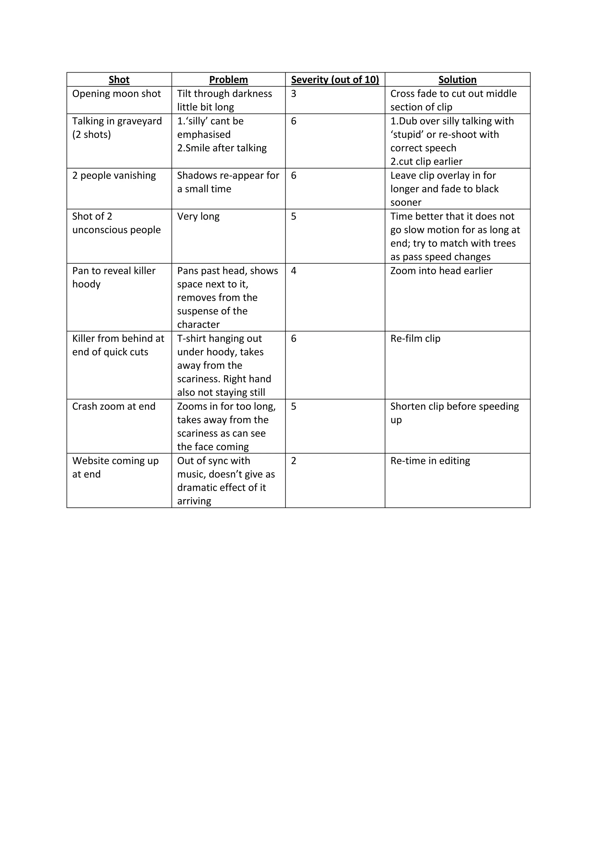 The document provides a list of shots from a film with identified problems and their assigned severity levels out of 10. Suggested solutions are also provided to address issues such as clips being too long, elements like a t-shirt or hands distracting from suspense, or timing issues that reduce dramatic effect. The solutions generally involve shortening or re-timing clips, dubbing over audio, leaving elements in view longer, or re-shooting parts of scenes.